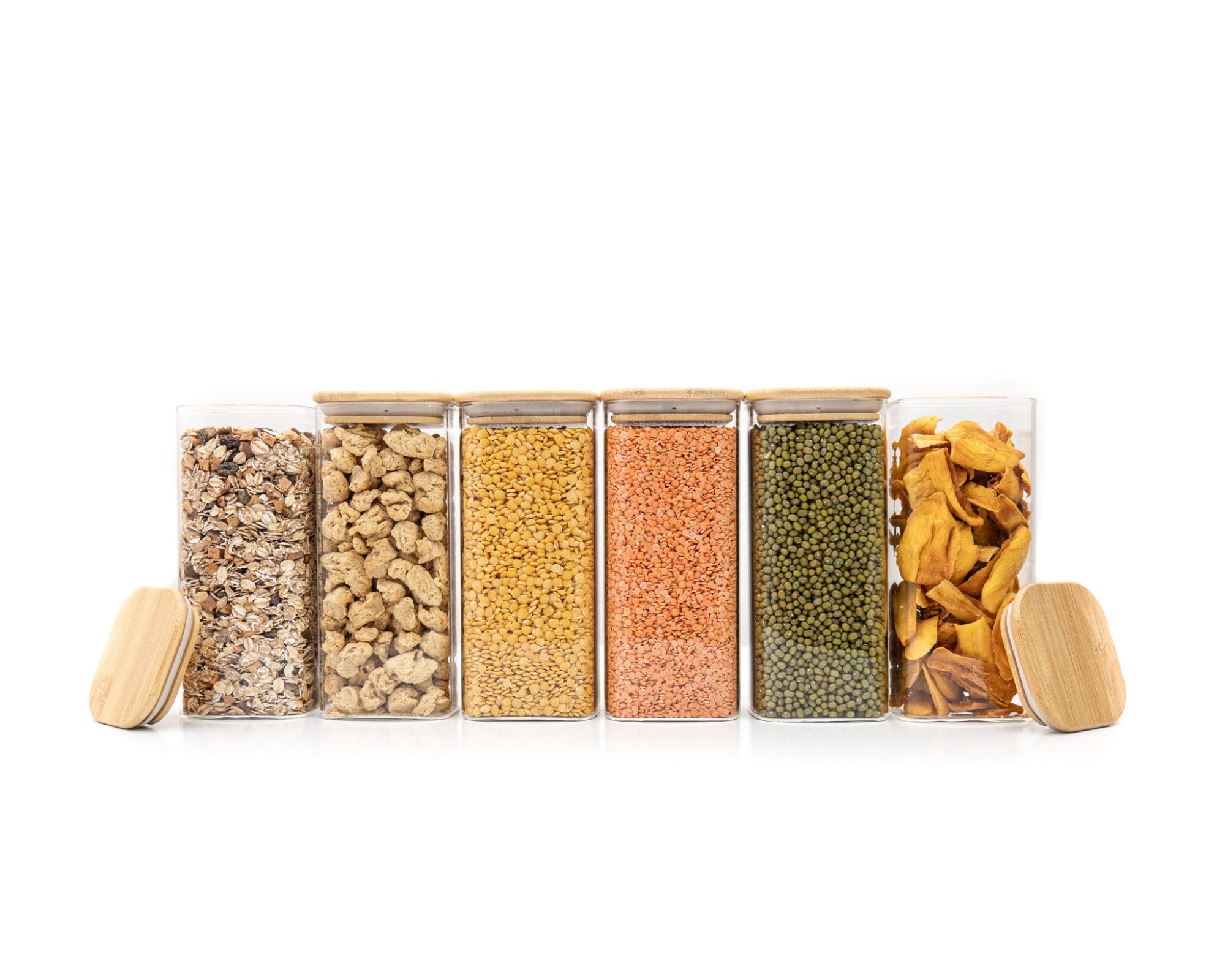 • Vorratsgläser aus Glas mit quadratischem Bambusdeckel