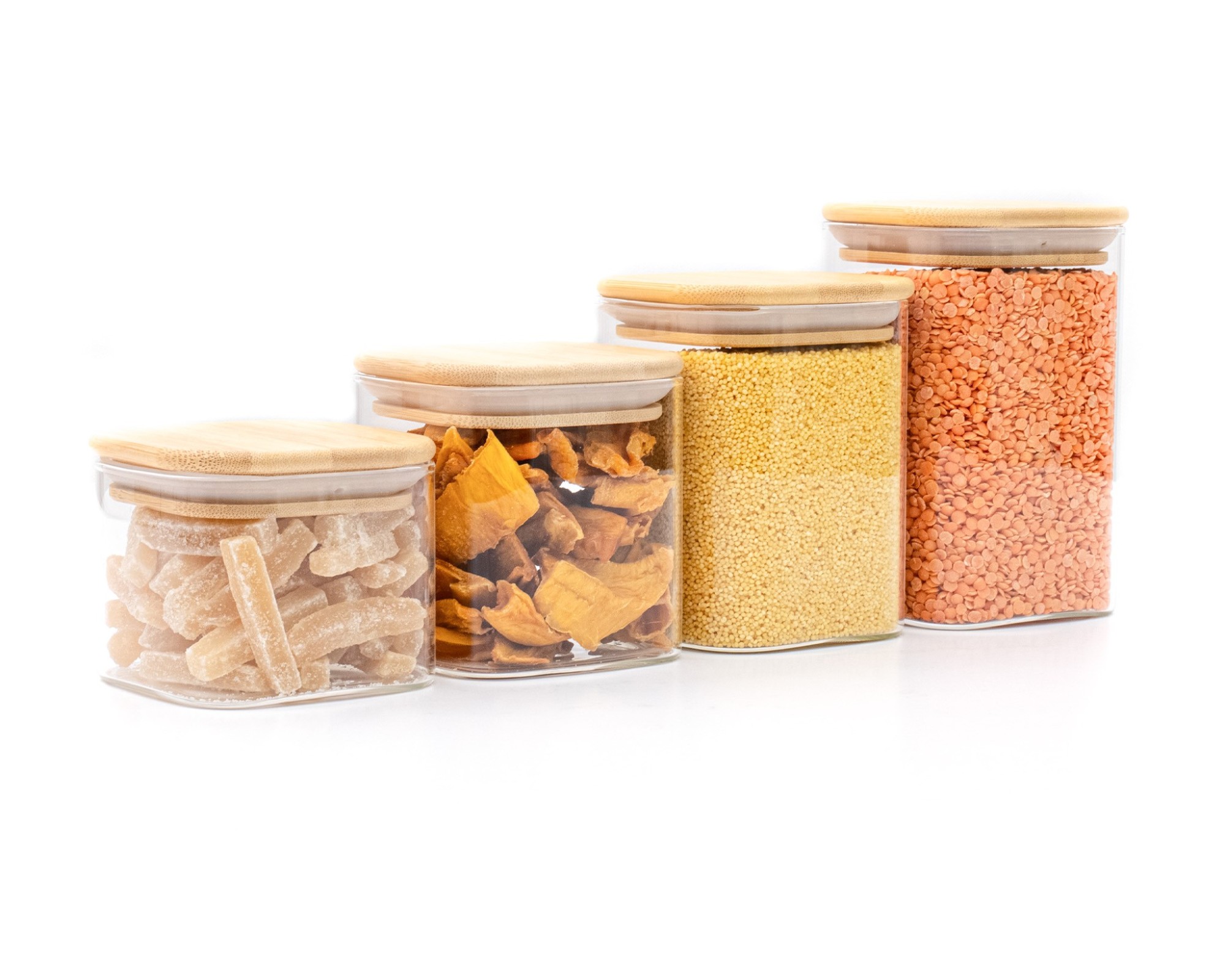 • Schmale quadratische Vorratsgläser aus Glas mit Bambusdeckel und 8cm Durchmesser