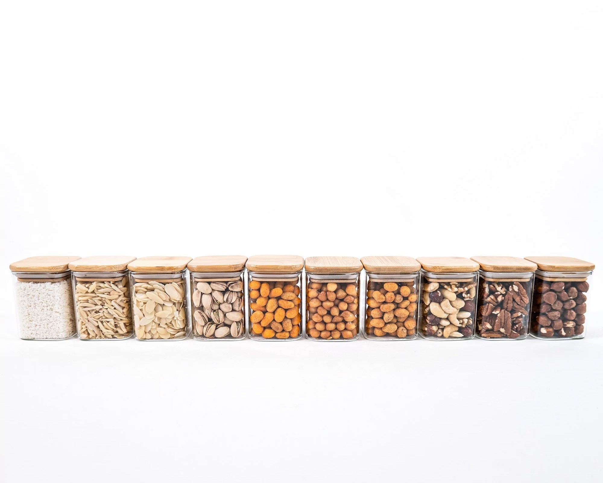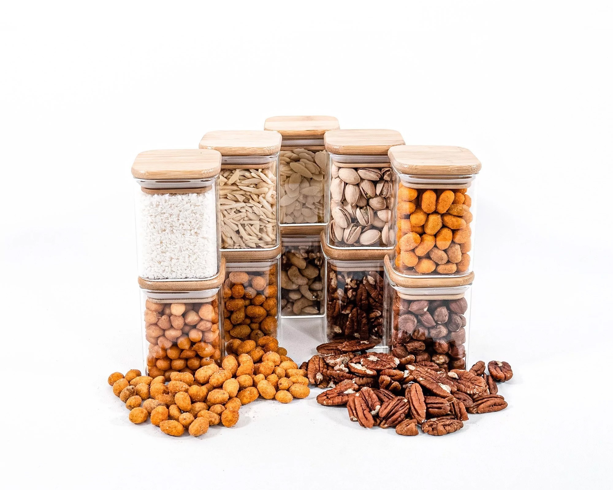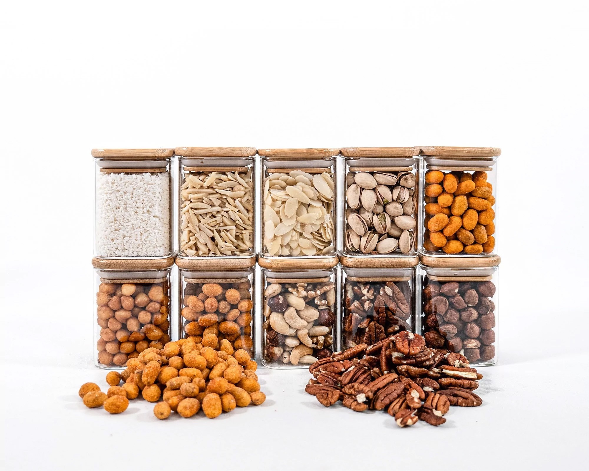 10 schmale quadratische Vorratsgläser aus Glas mit Bambusdeckel