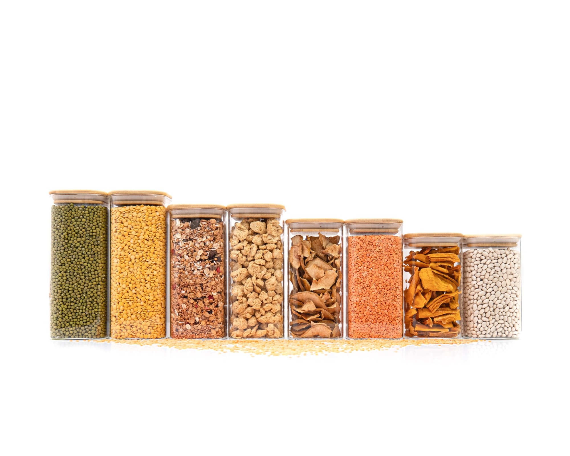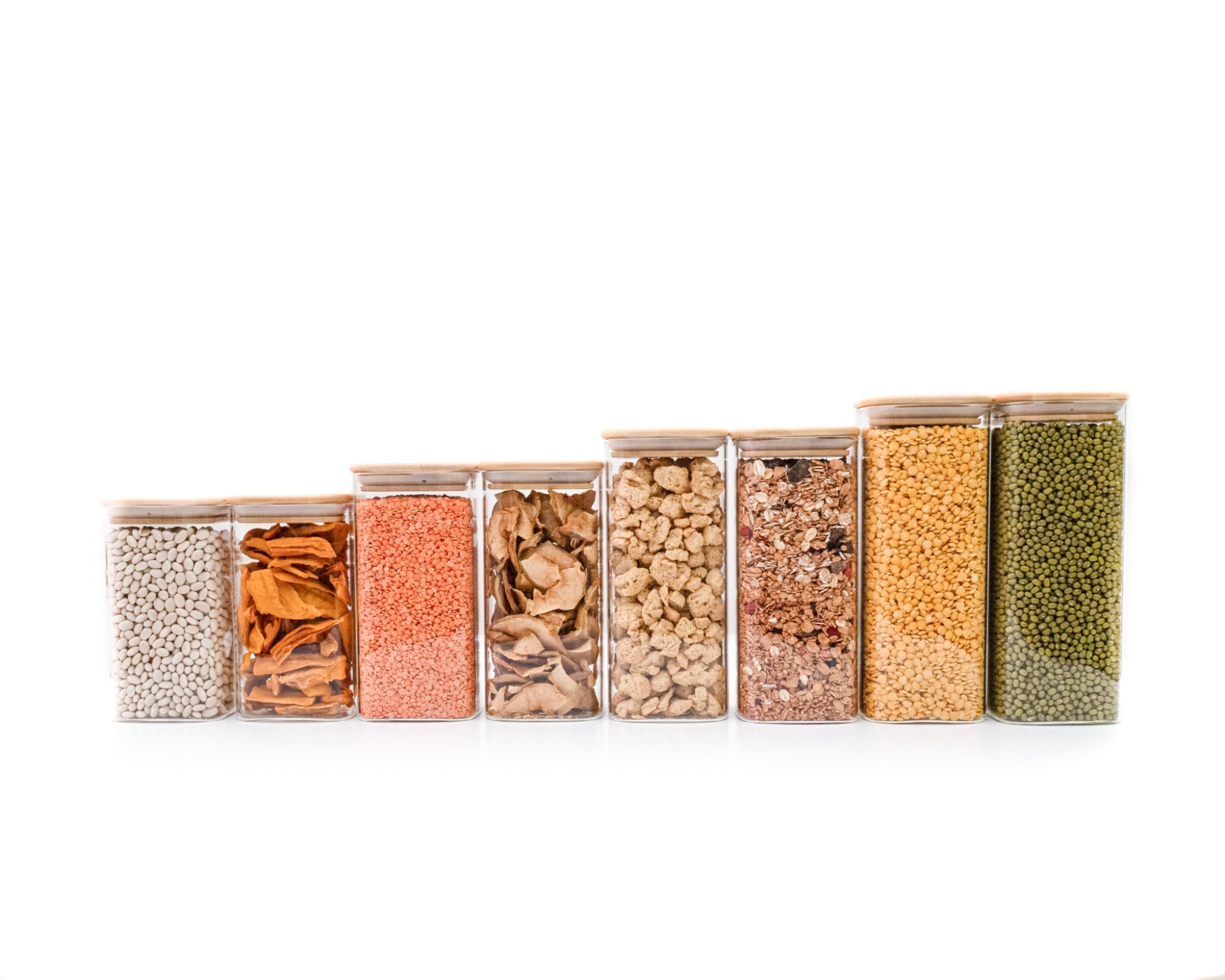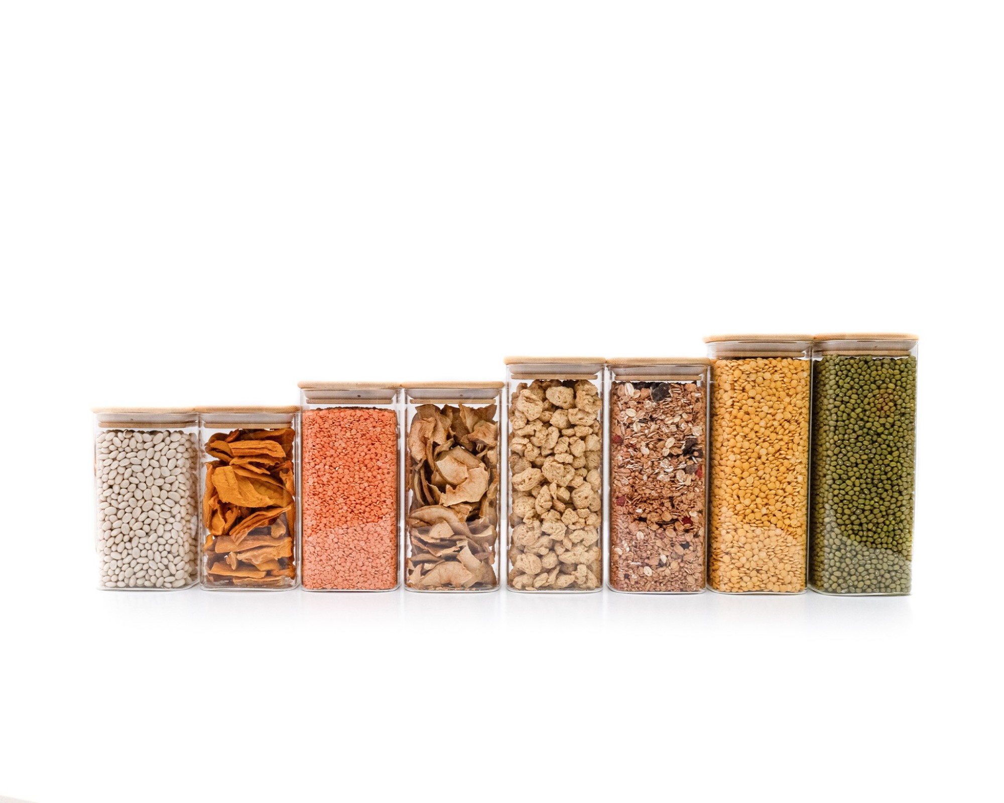 Mit diesen 8 schmalen quadratischen Vorratsgläsern je (2 Stück mit dem Volumen 800ml, 900ml, 1050ml und 1200ml kannst du deine Vorräte über das ganze Jahr sicher verstauen. Der Vorteil von durchsichtigen Aufbewahrungsgläsern ist, das du immer weisst, wie es deinen Lebensmitteln geht. Durch den