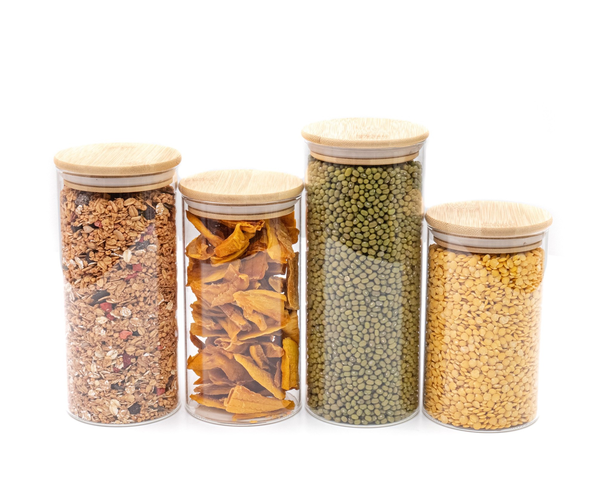 4 stabile Glasbehälter mit 4 unterschiedlichen Höhen (14cm, 16cm, 18cm und 20cm, mit Deckel jeweils 1cm höher)