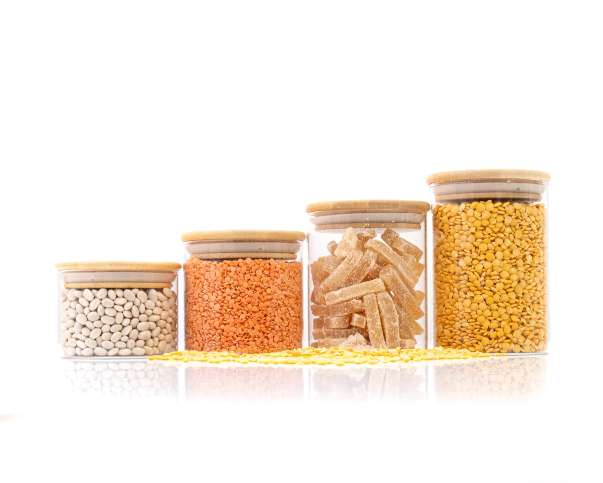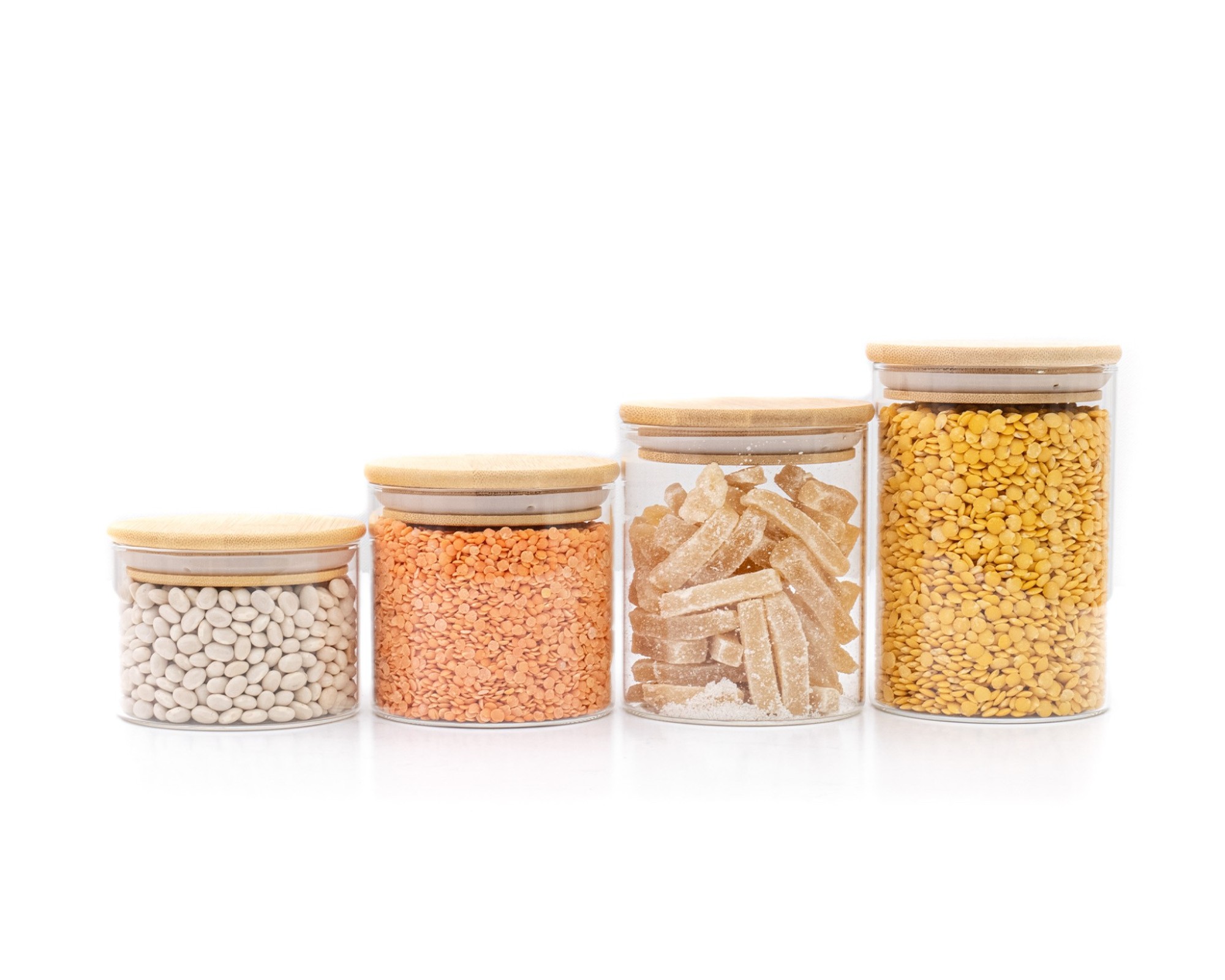 • 4 stabile Glasbehälter mit 4 unterschiedlichen Höhen (6cm, 8cm, 10cm und 12cm, mit Deckel jeweils 1cm höher)