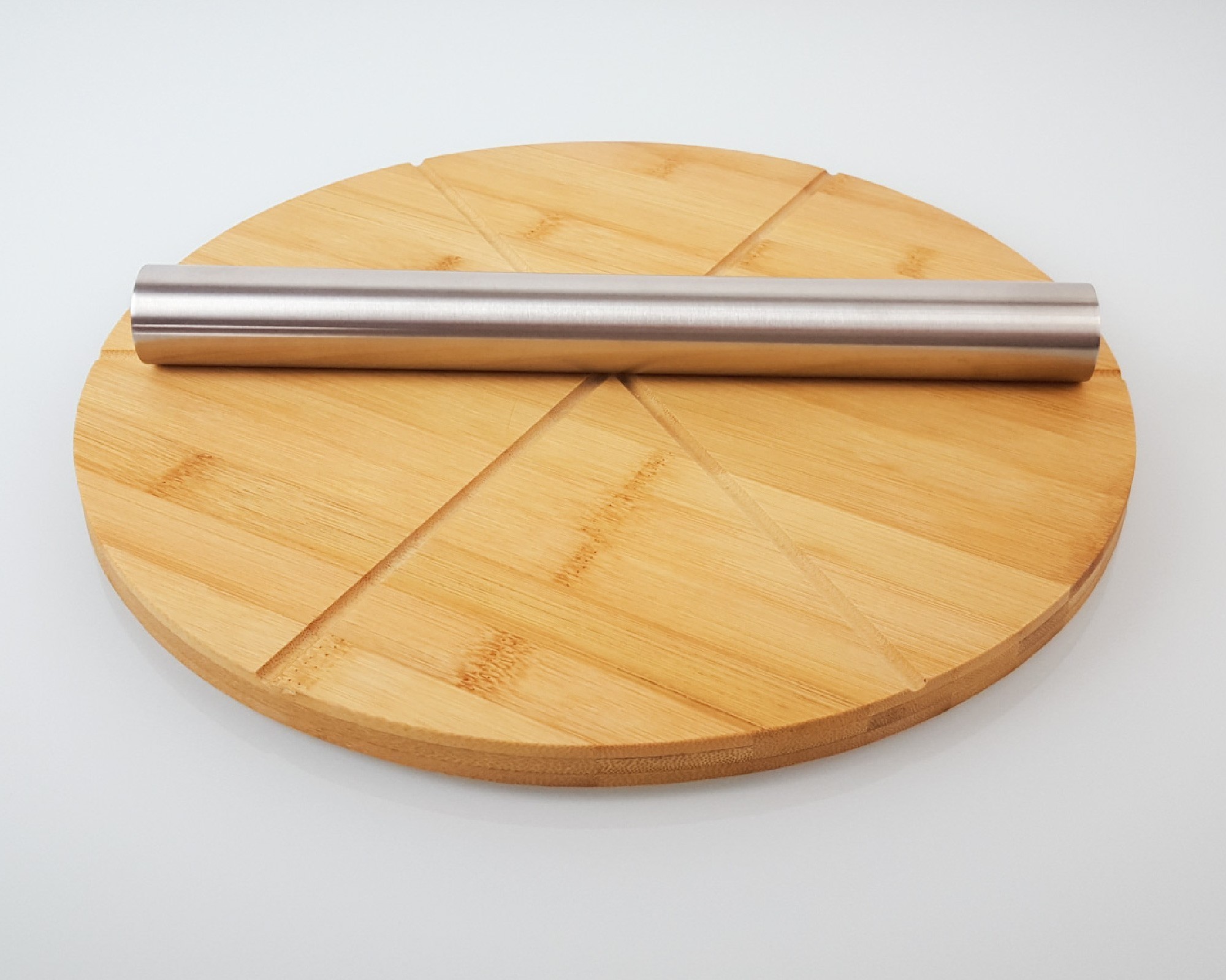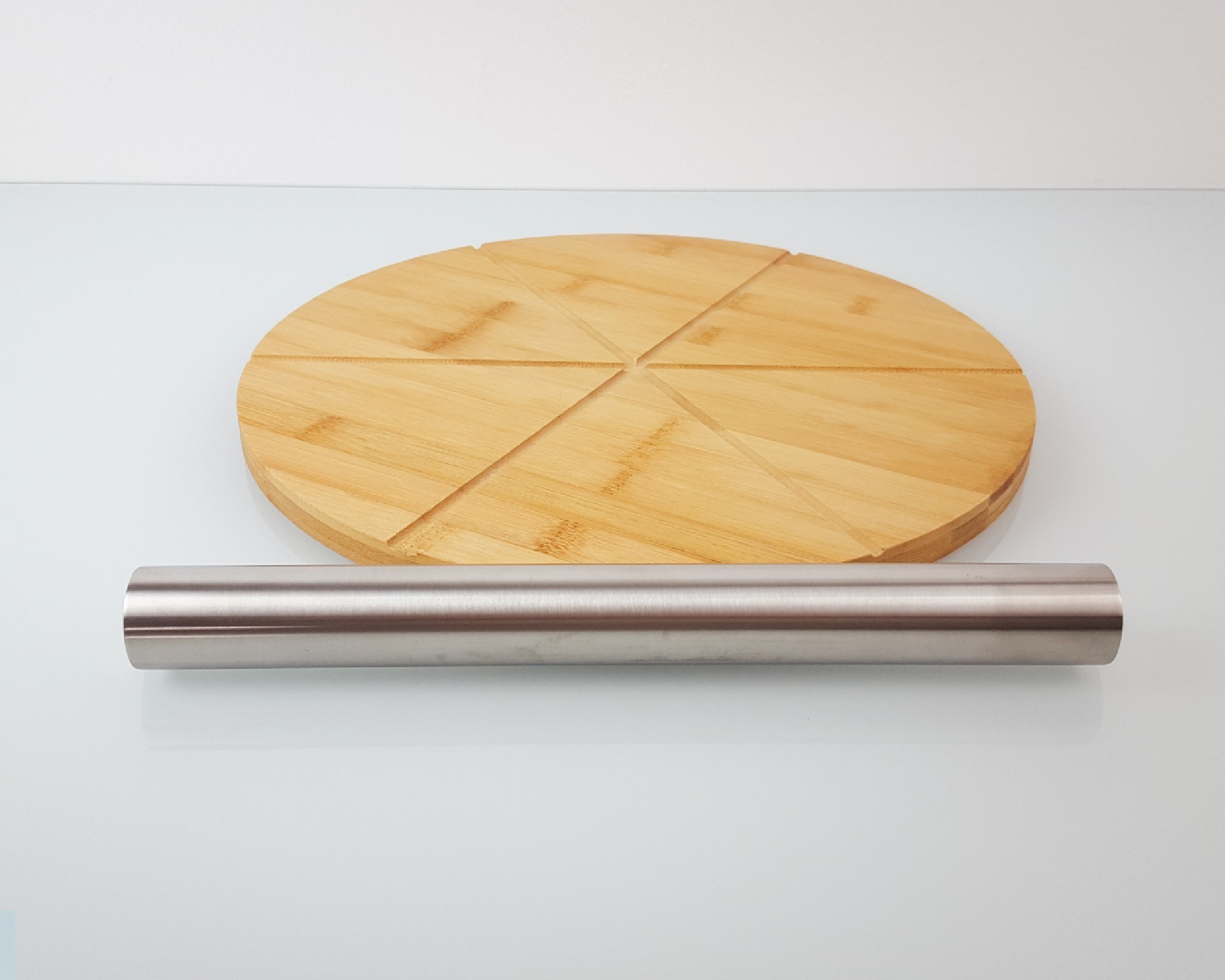 Dieser praktische Teigroller aus massivem Edelstahl hat sich für Pizzaböden gut bewährt. Dadurch, dass er aus einem Stück verarbeitet wurde und die Oberfläche besonders glatt ist bleiben keine Teigreste hängen.