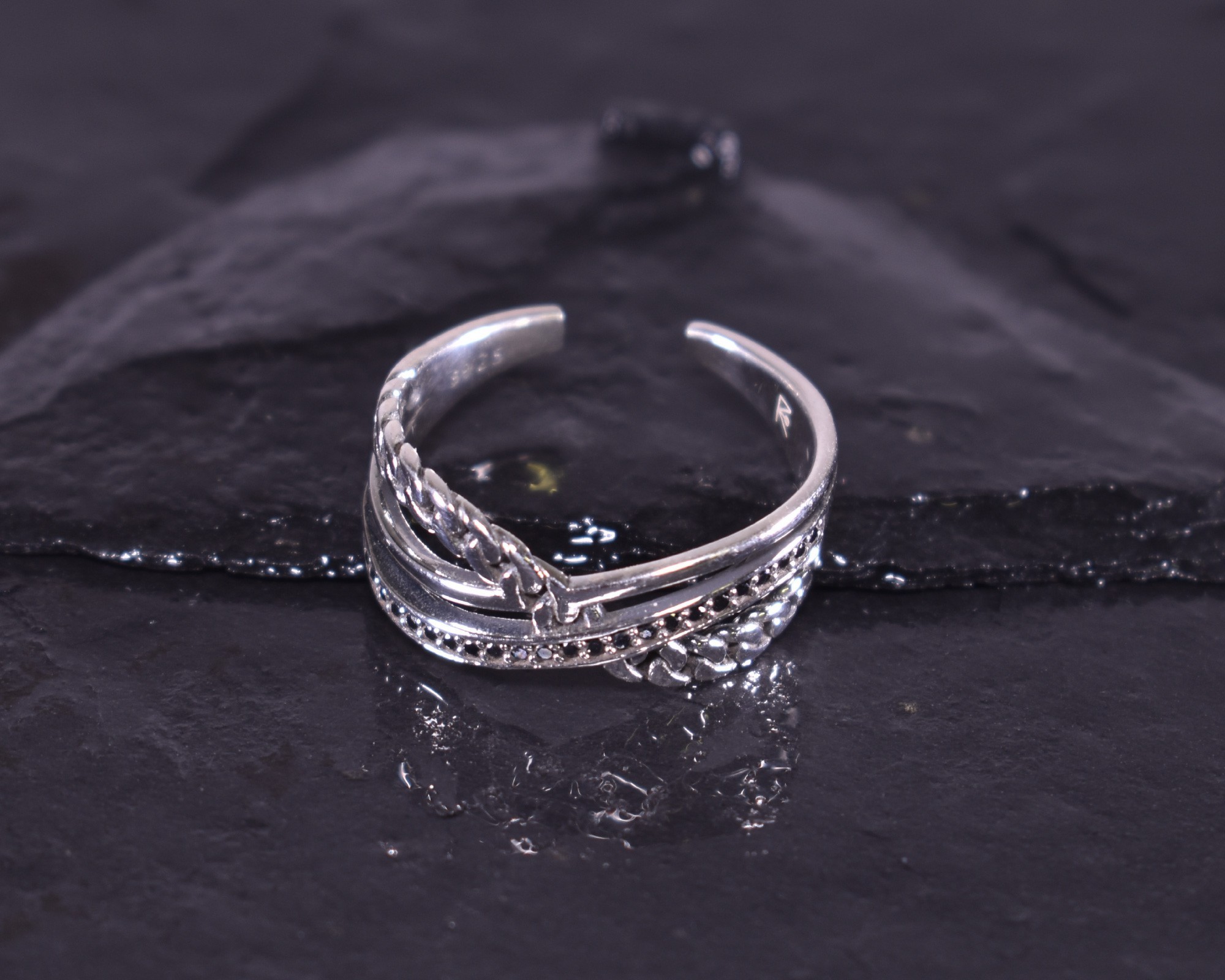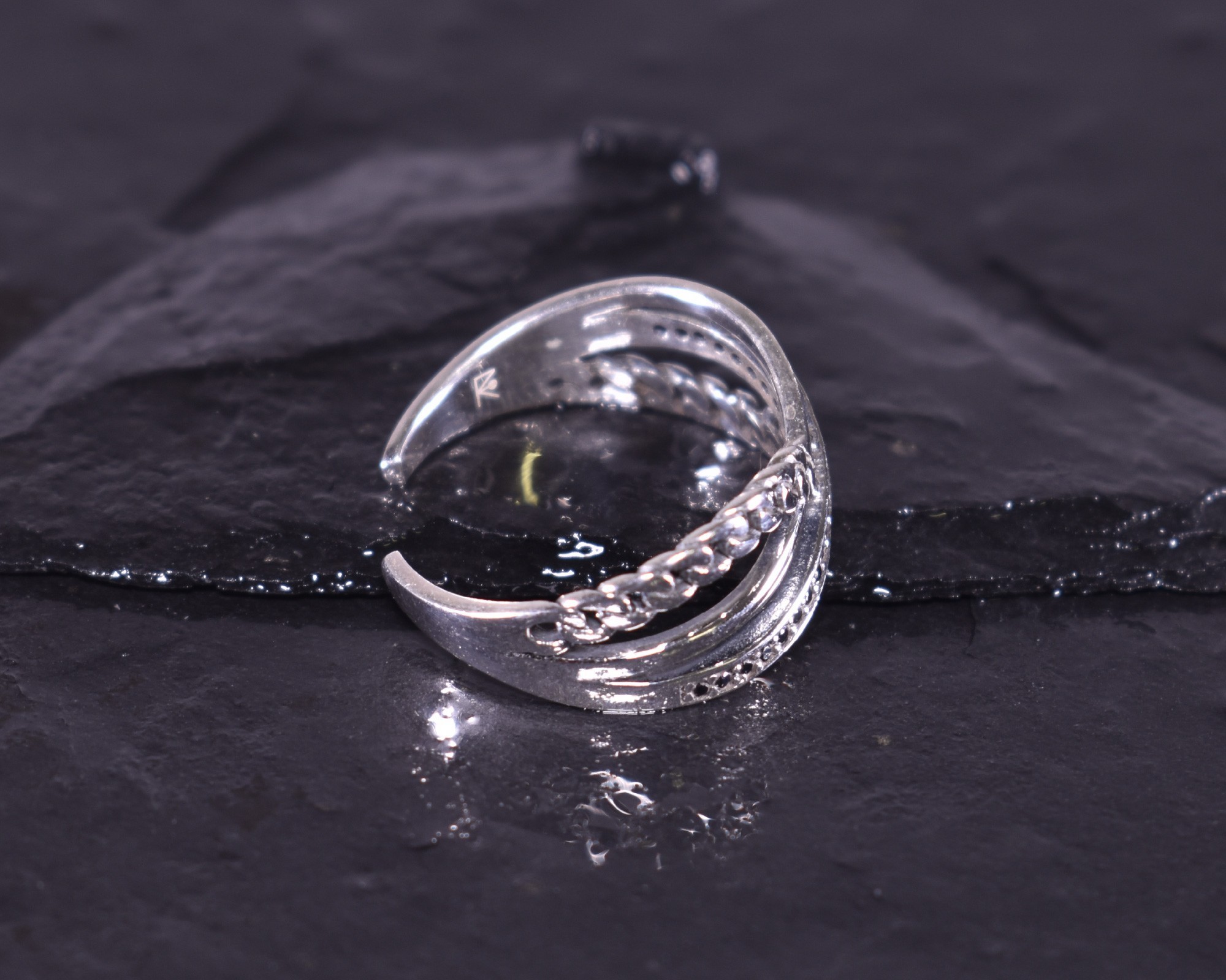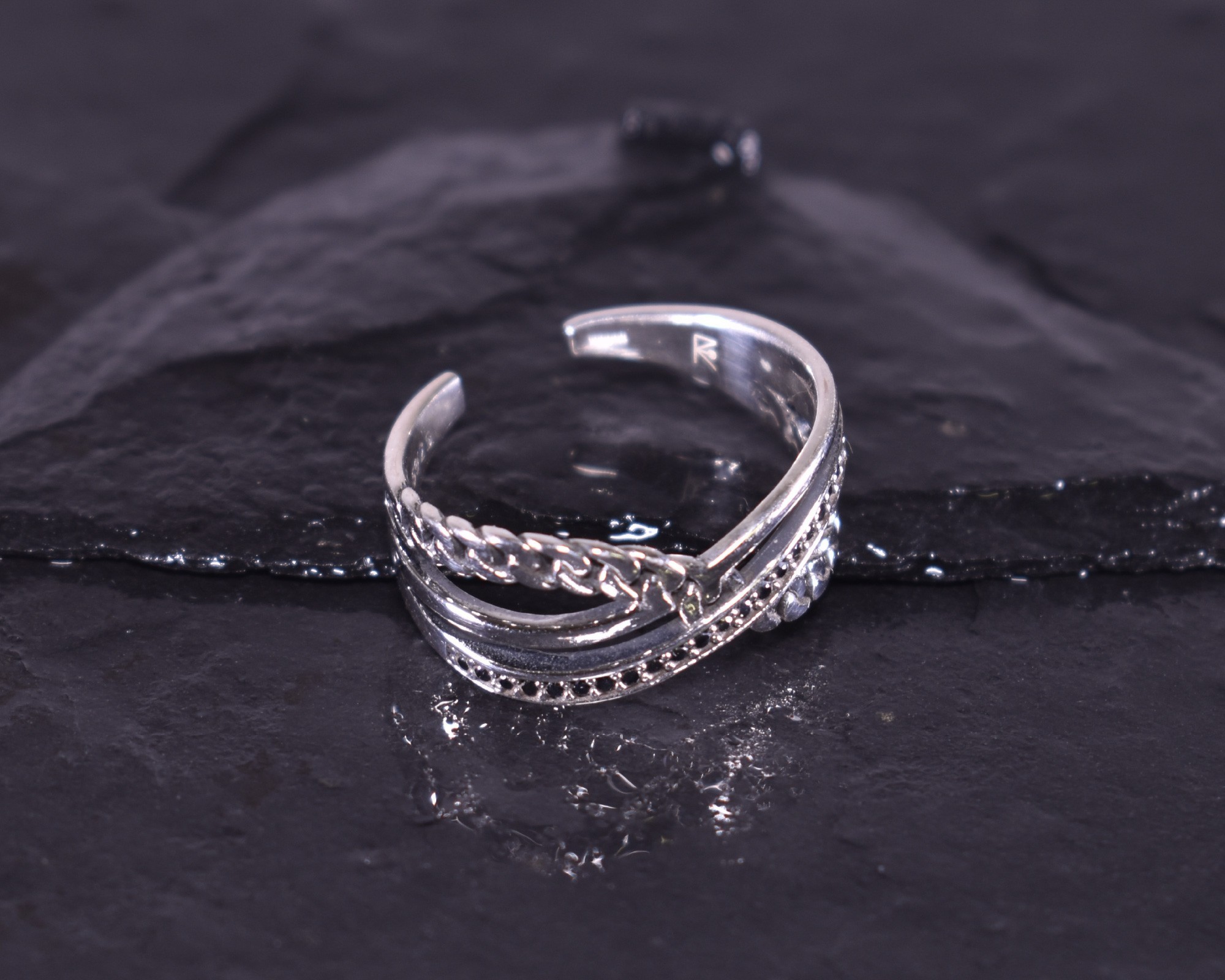 D rei verschieden geformte Ringe bilden diesen offenen Silberring. Der feinste, ein delikater glattpolierter Ring, darüber ein Kettenglied Ring und im Kontrast der dunkle, mit kleinen Silberdetails versetzte, Silberring. Diese Vielfalt macht das Accessoire zu einem gut kombinierbaren Schmuckstück.