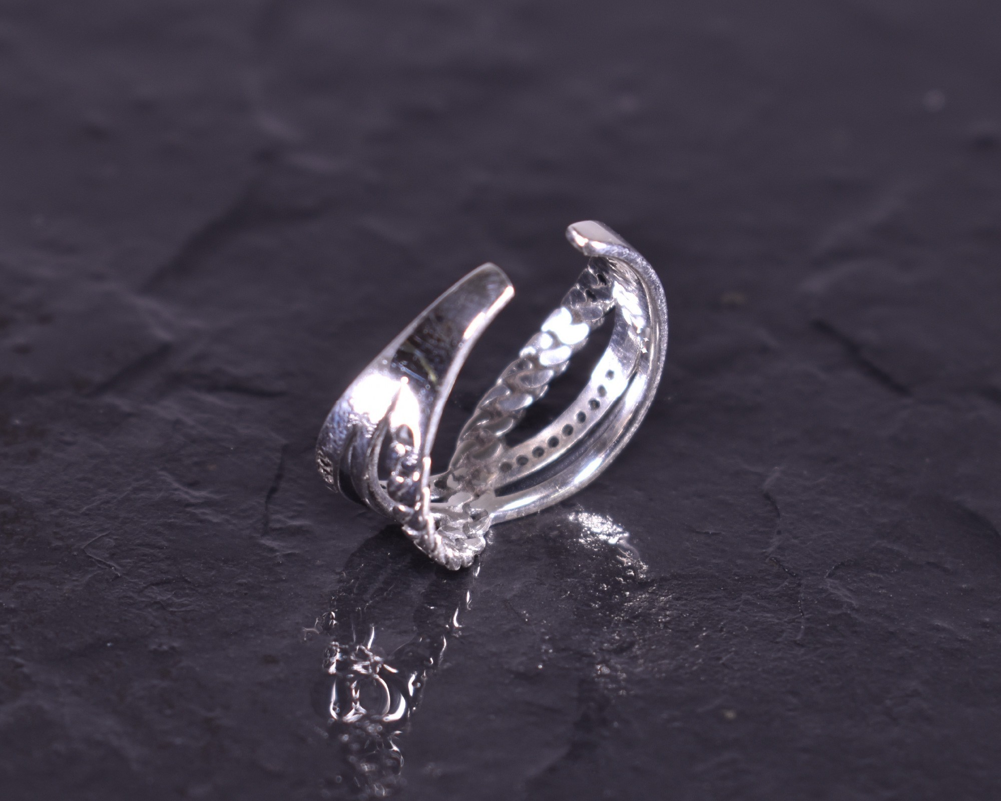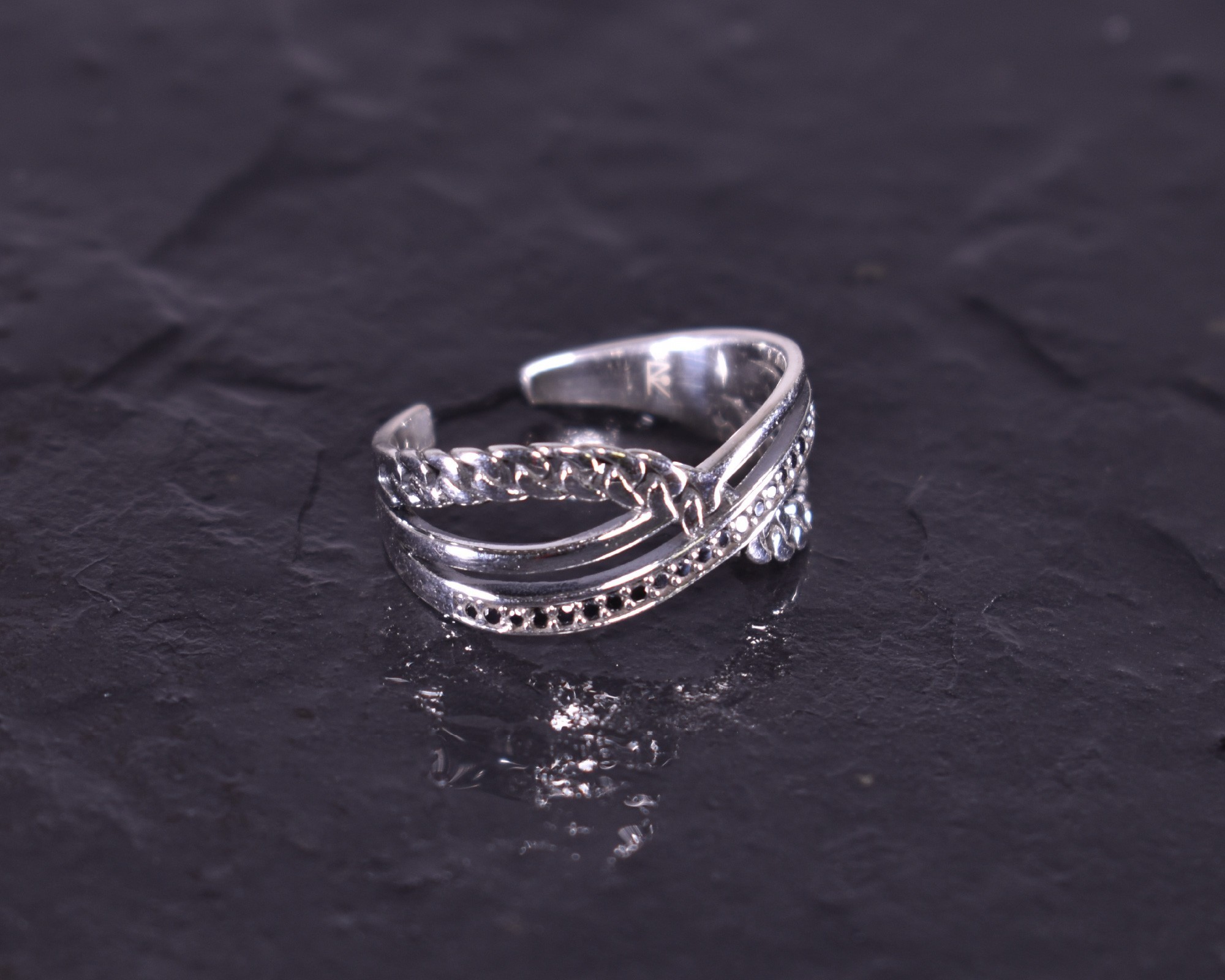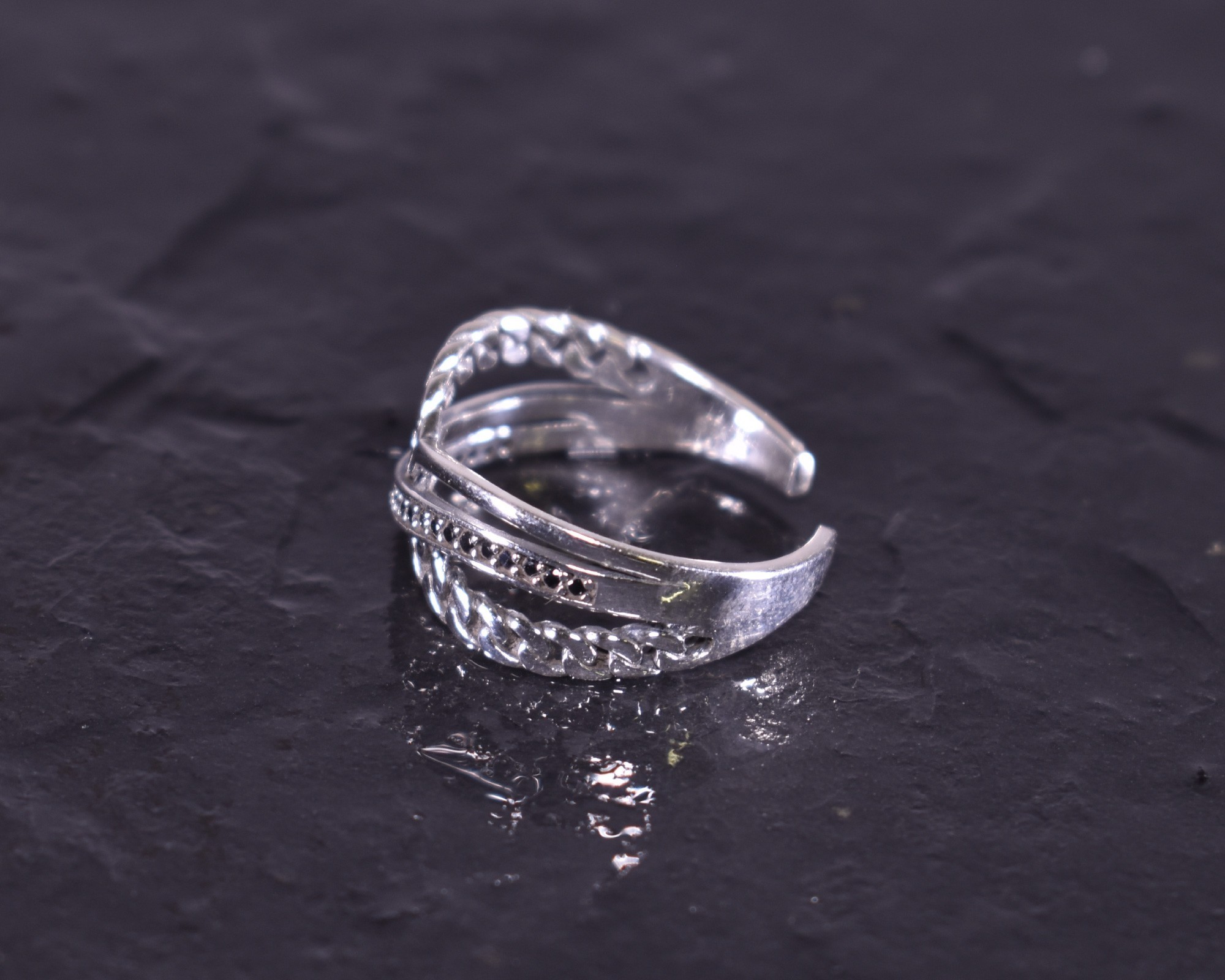D rei verschieden geformte Ringe bilden diesen offenen Silberring. Der feinste, ein delikater glattpolierter Ring, darüber ein Kettenglied Ring und im Kontrast der dunkle, mit kleinen Silberdetails versetzte, Silberring. Diese Vielfalt macht das Accessoire zu einem gut kombinierbaren Schmuckstück.