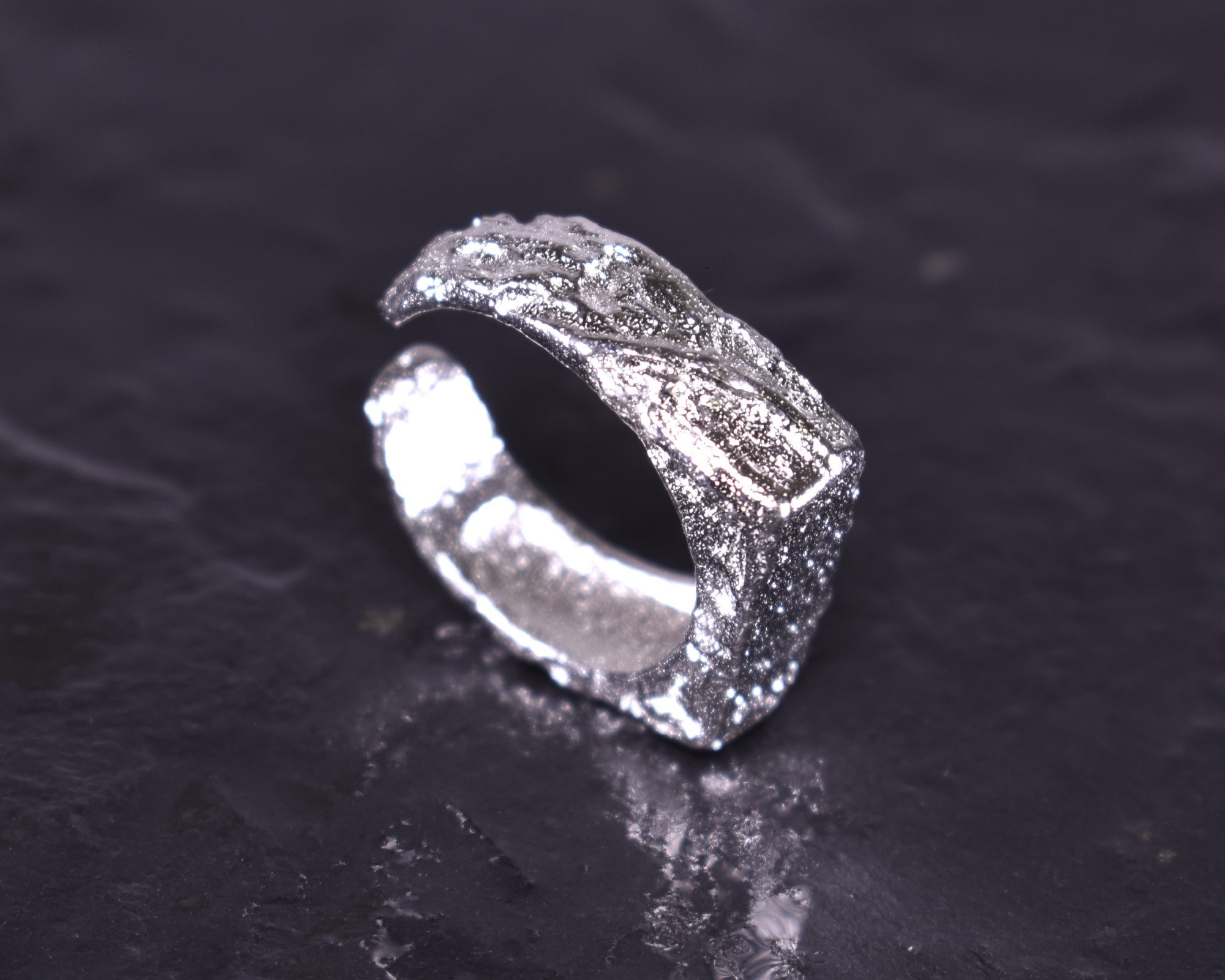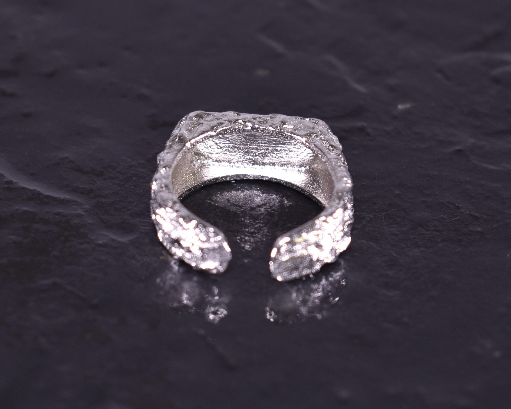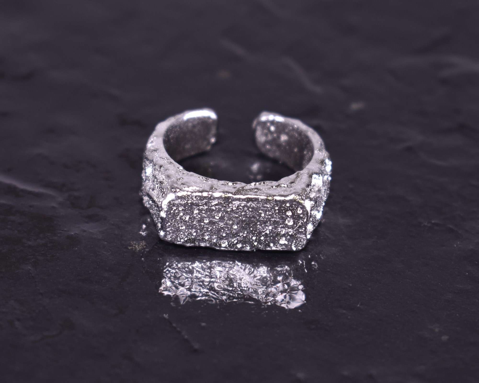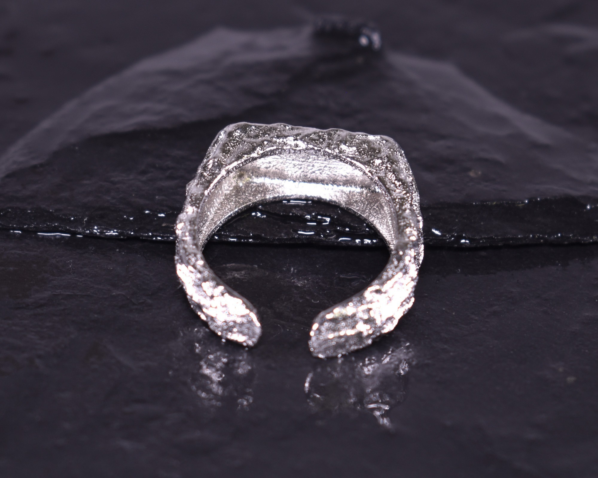 H ier erinnert die Form an einen klassischen Siegelring. Die einzigartige Oberflächenstruktur dieses offenen Silberringes macht dieses Schmuckstück zu einem extravaganten Accessoire. Ein schönes Geschenk.