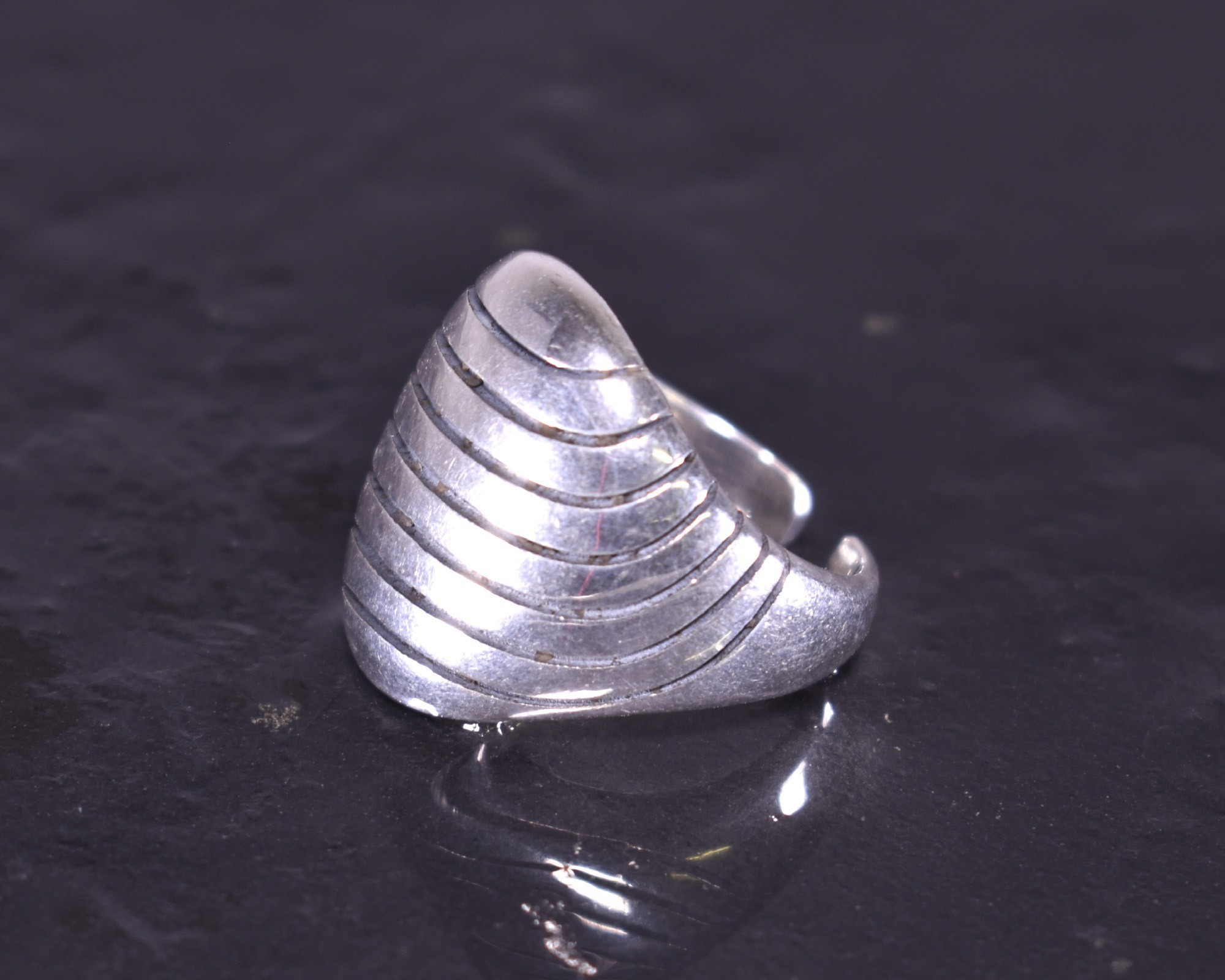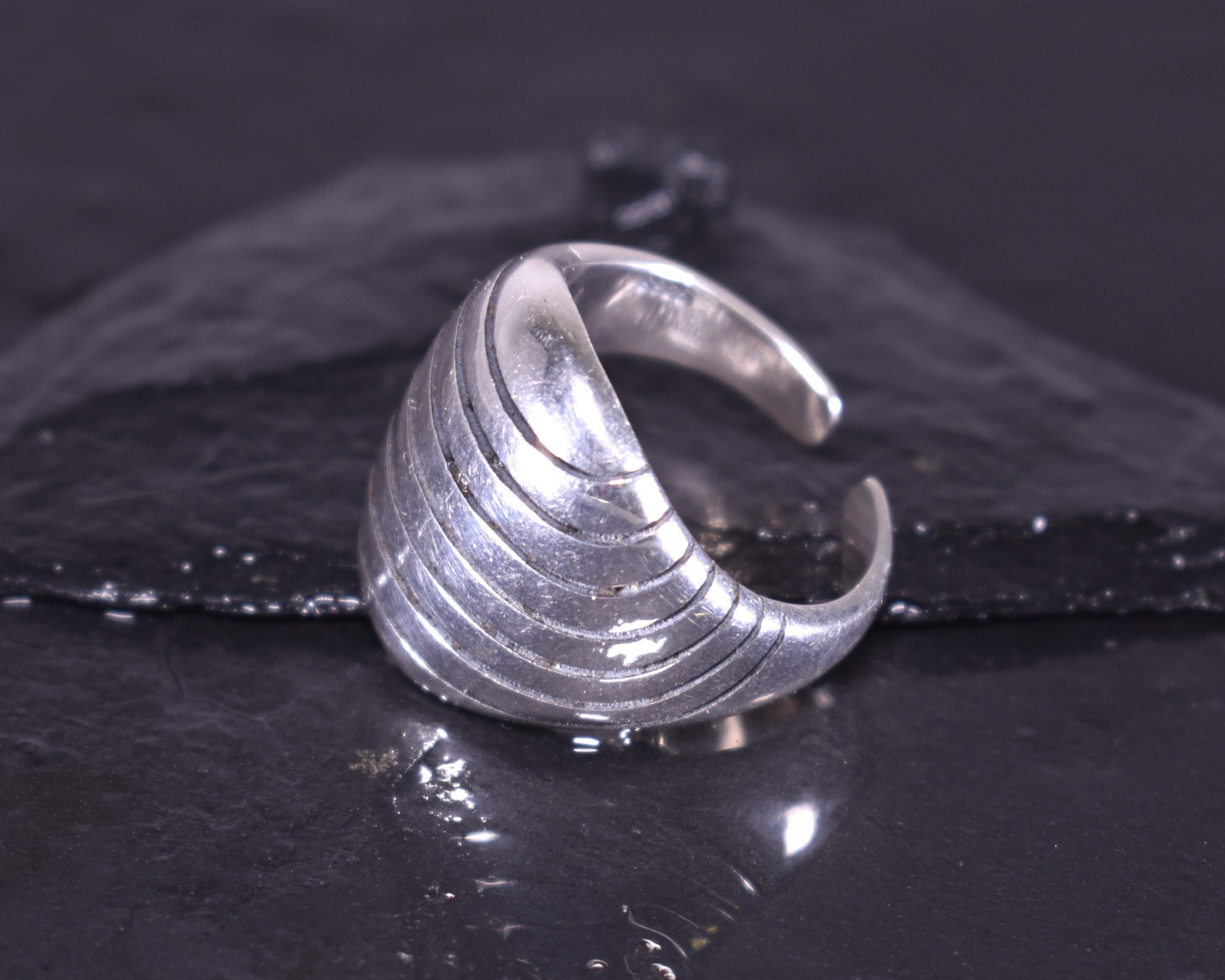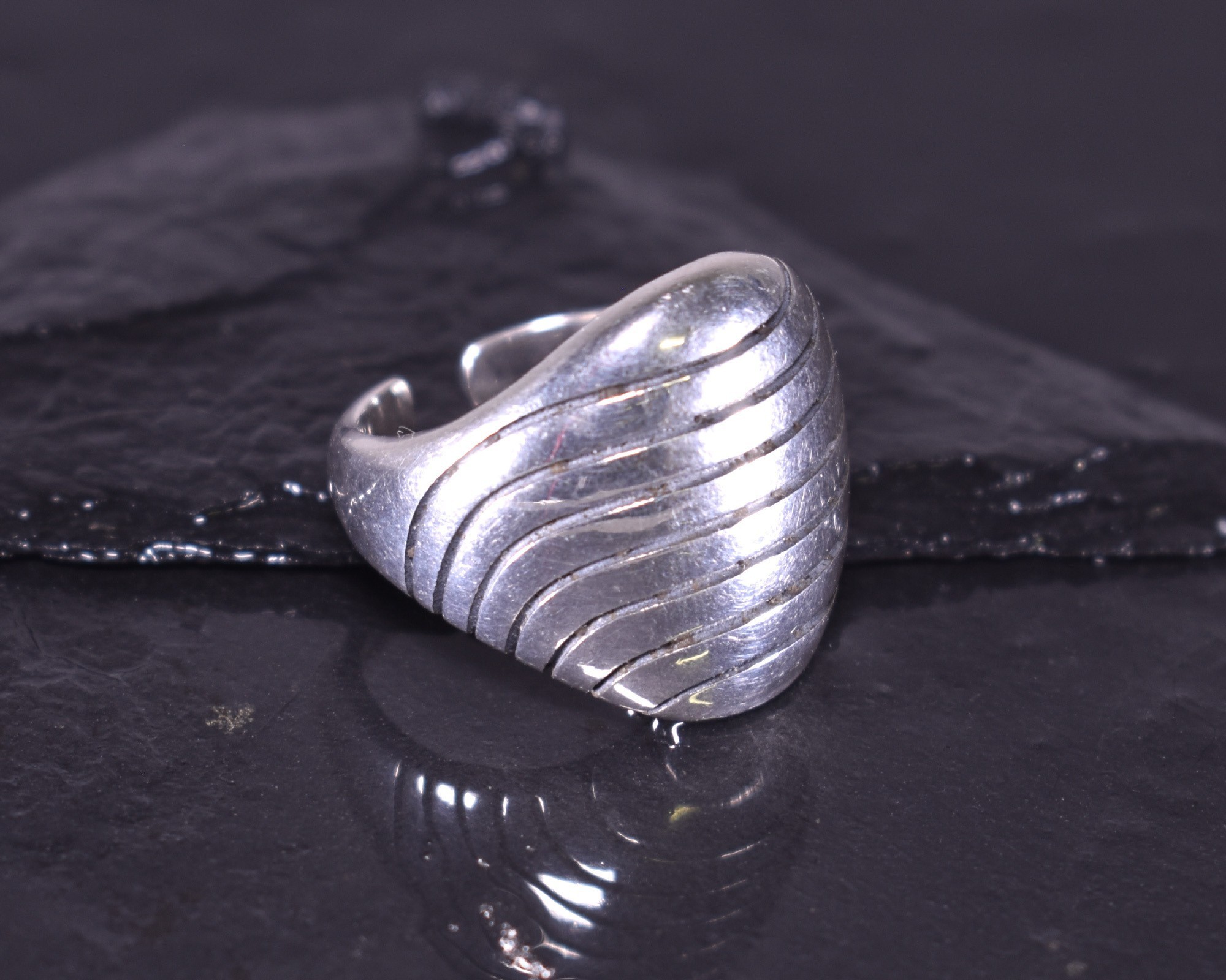 D ie kunstvoll geschwungenen Linien brechen die klassische Form und bilden den Charakter dieses offenen Silberringes. Die glattpolierte Oberfläche steht in schönem Kontrast zu den dunklen Linien.