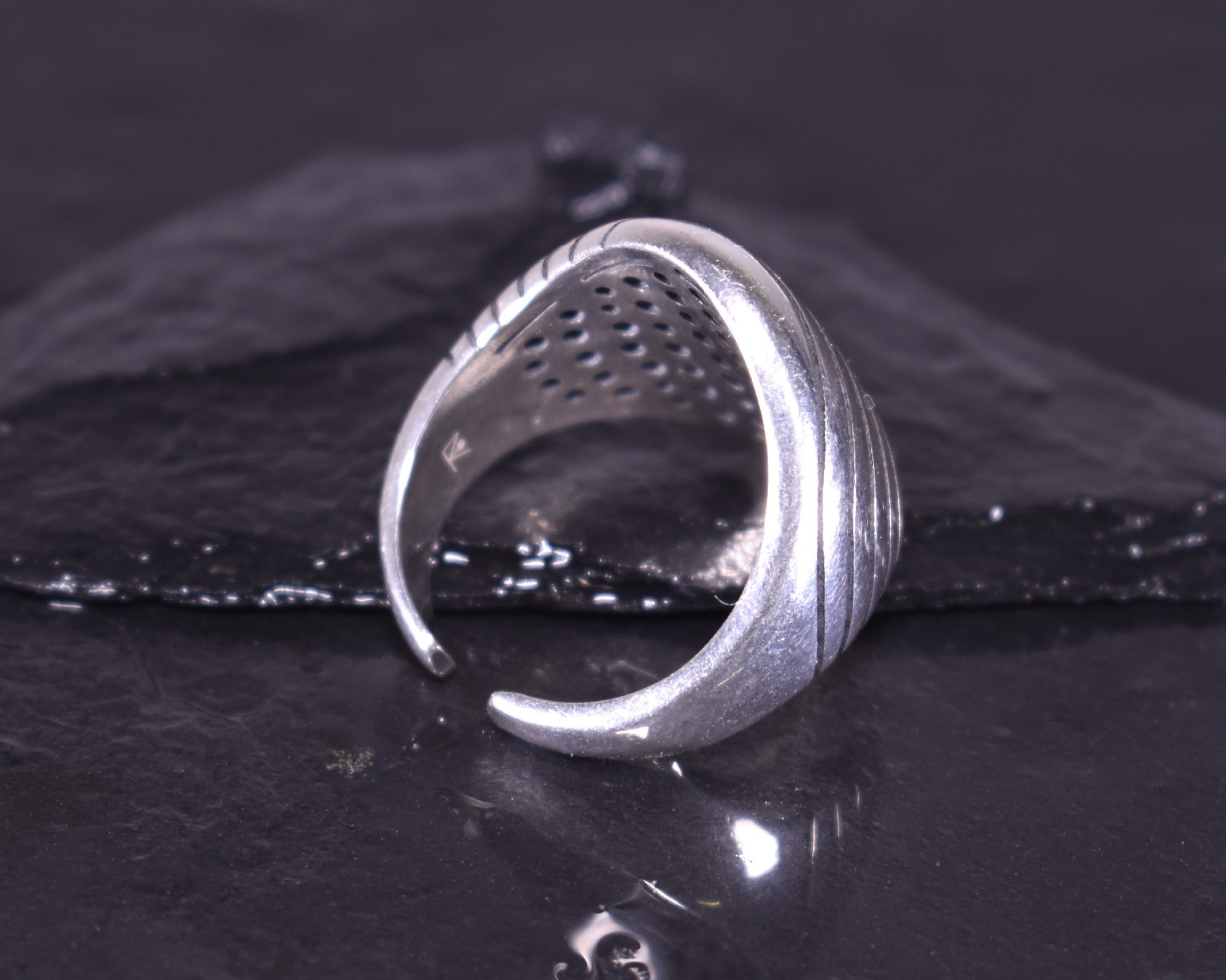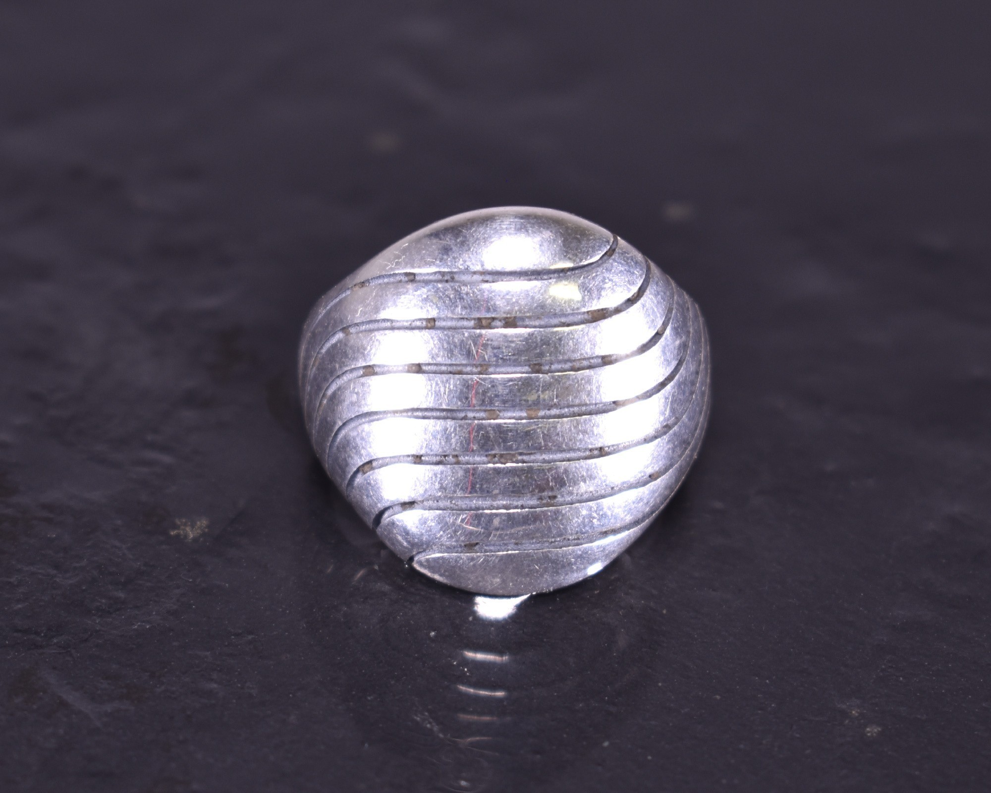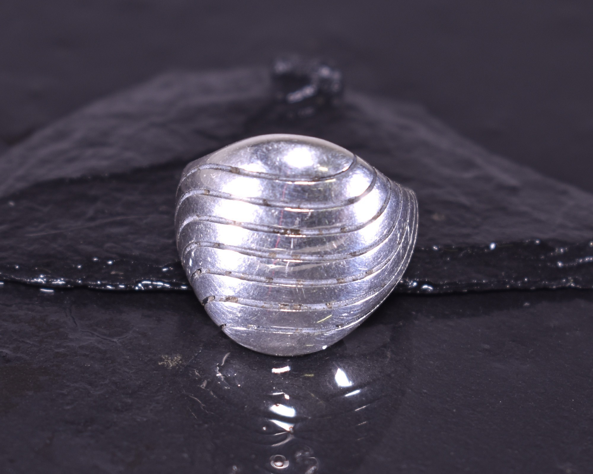 D ie kunstvoll geschwungenen Linien brechen die klassische Form und bilden den Charakter dieses offenen Silberringes. Die glattpolierte Oberfläche steht in schönem Kontrast zu den dunklen Linien.