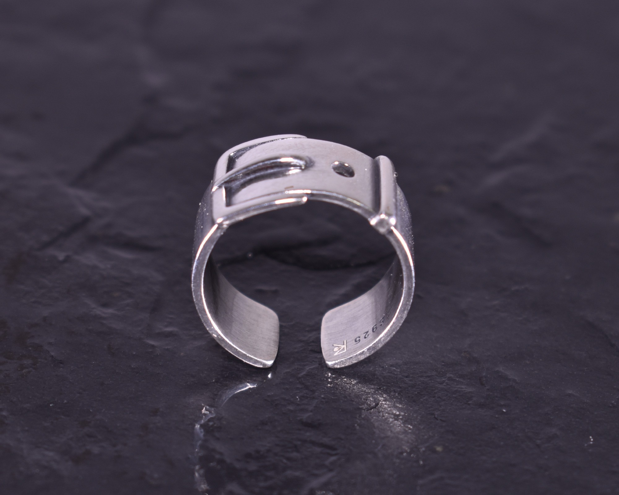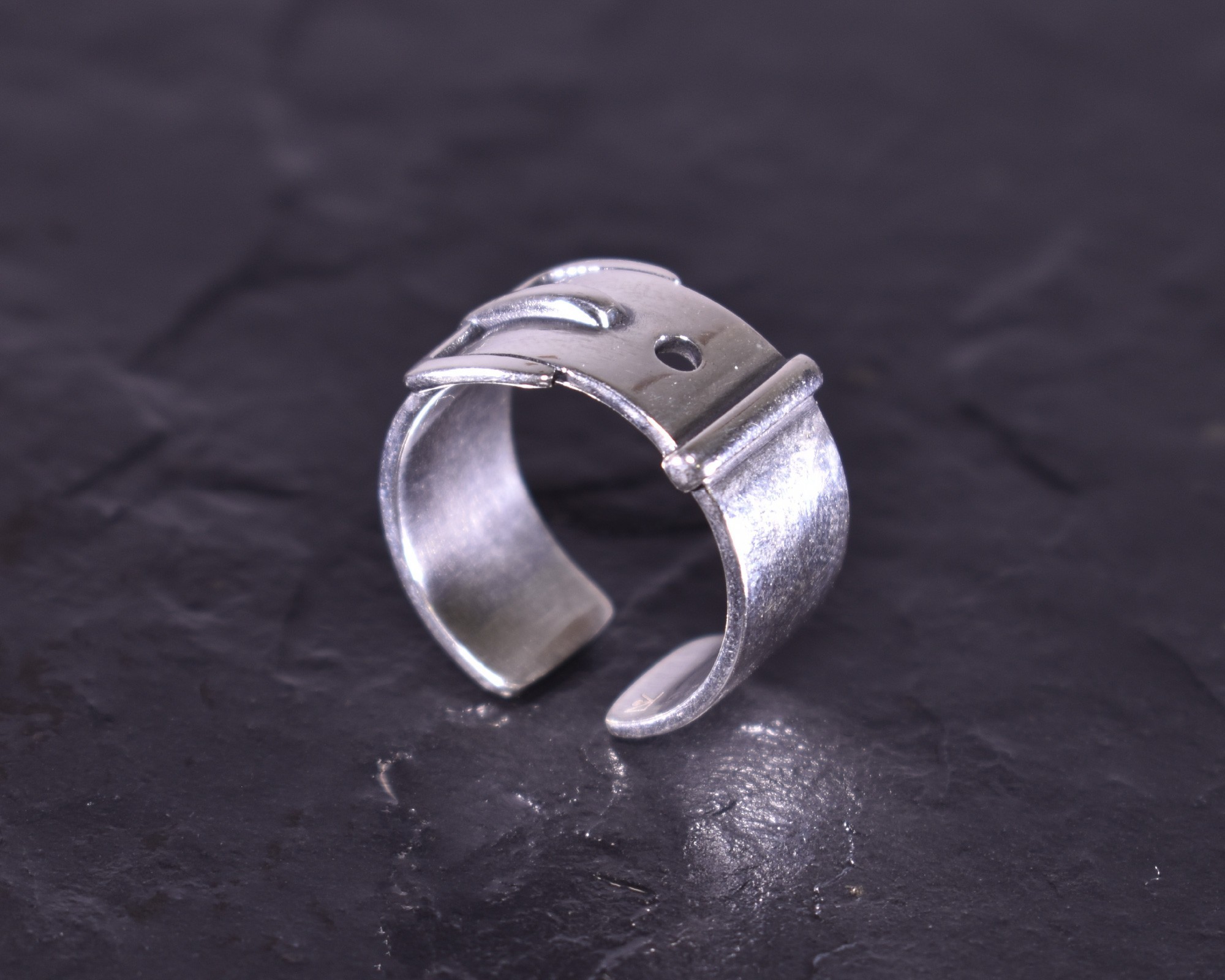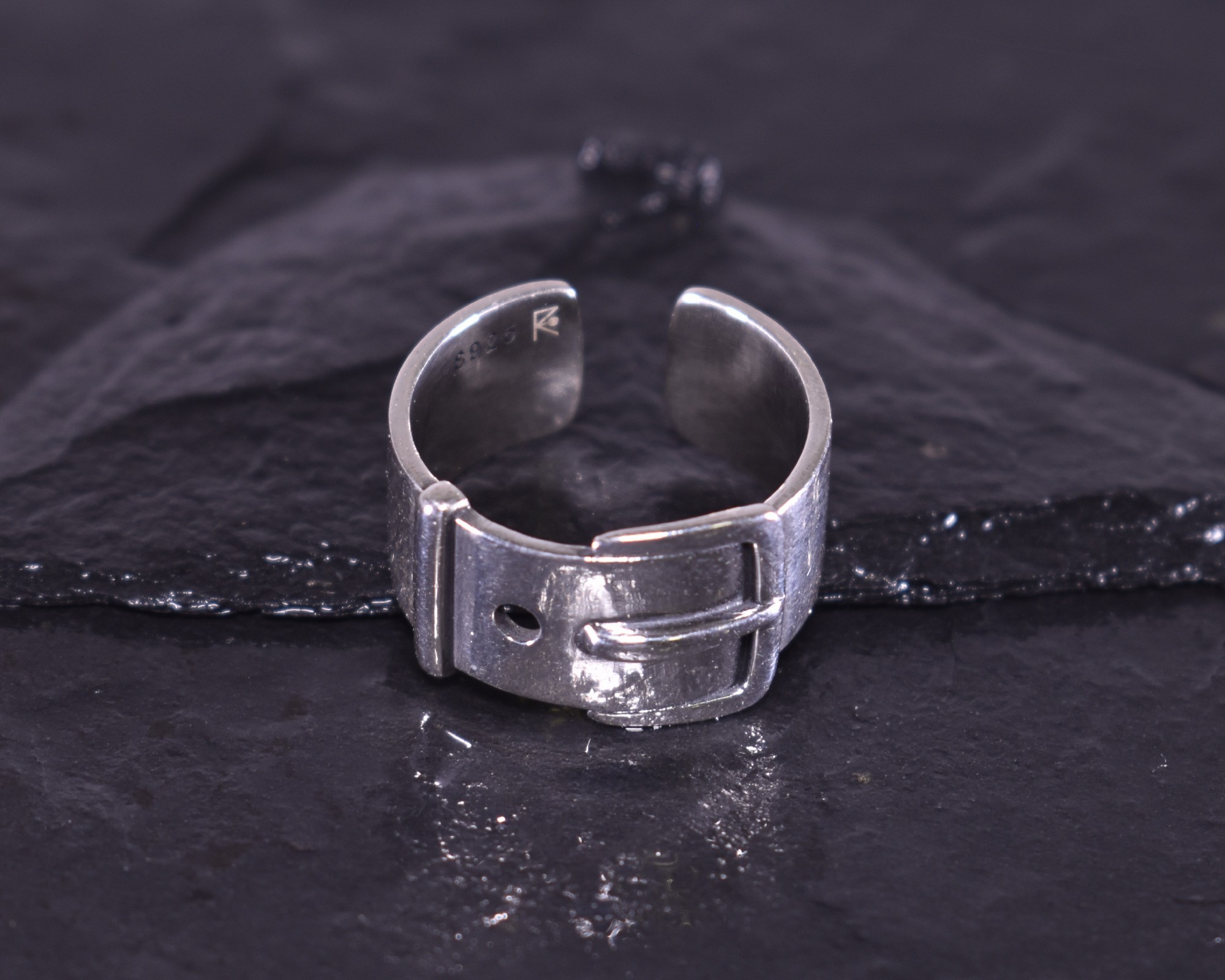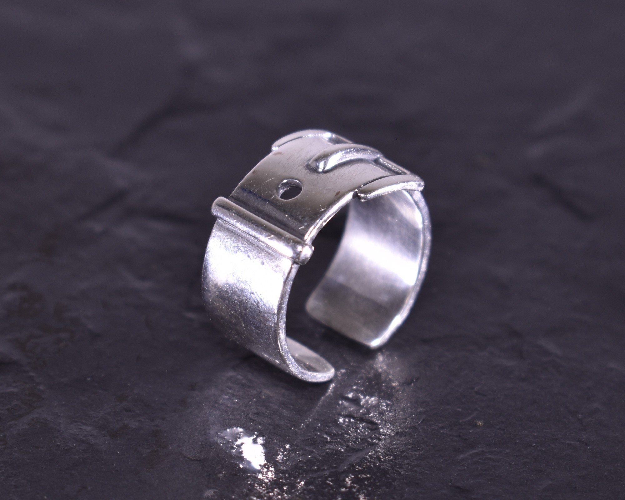 S ilberschnalle. Bei diesem offenen Silberring spricht das Design für sich. Die glattpolierten Details der Schnalle stehen in gutem Kontrast zum gebürsteten Ring. Ein Hingucker.