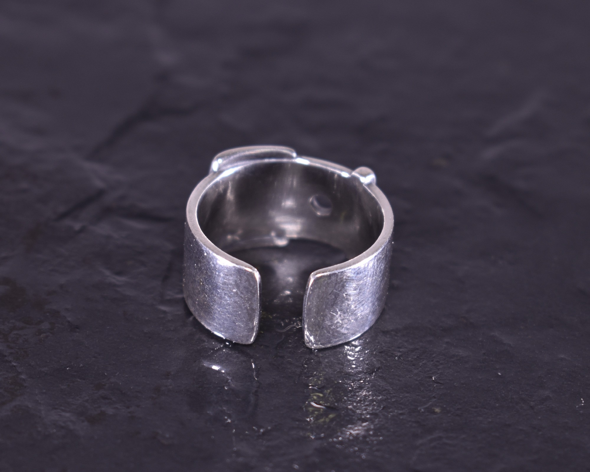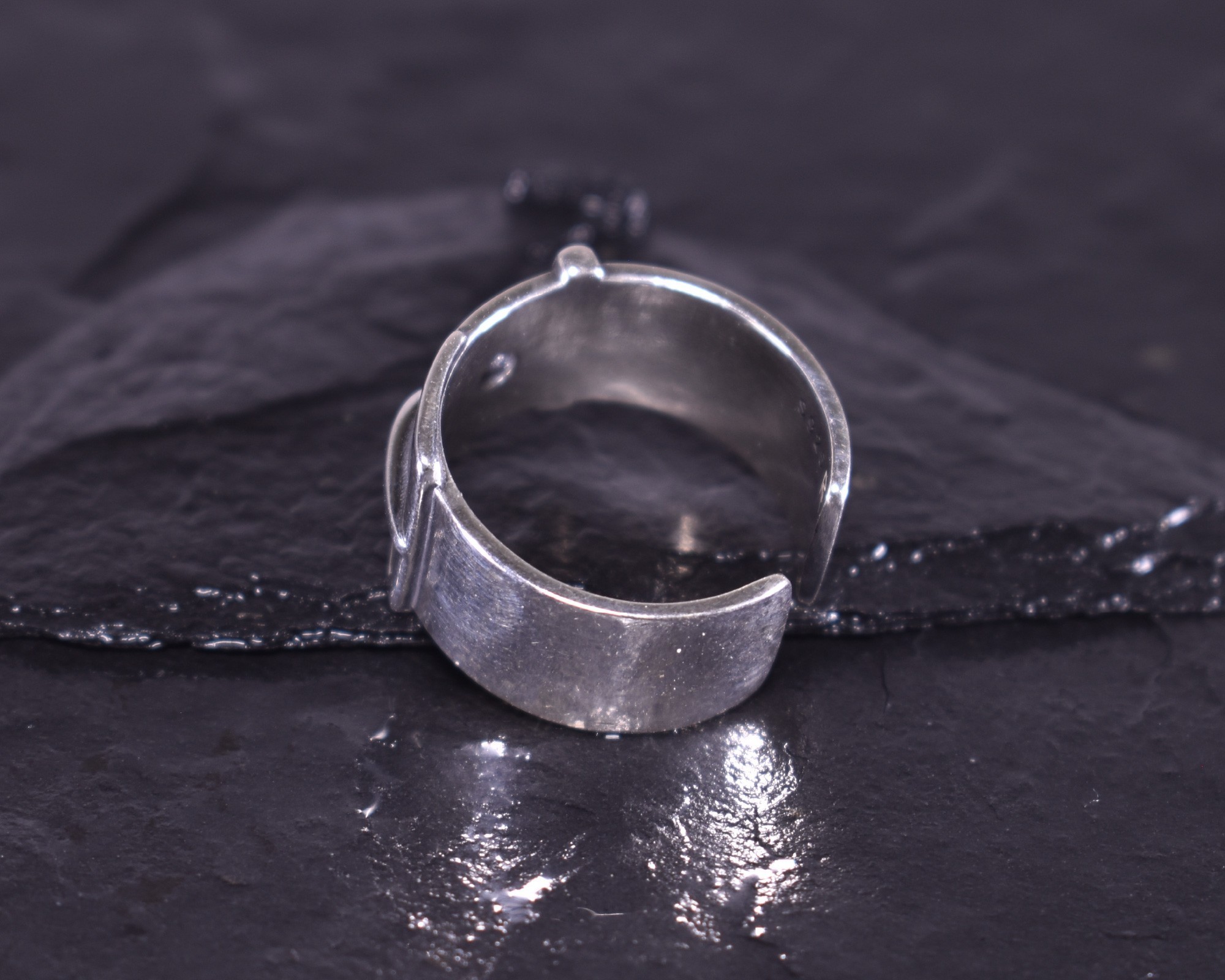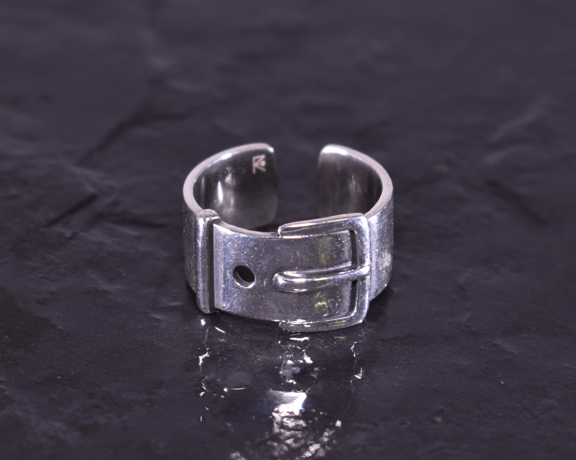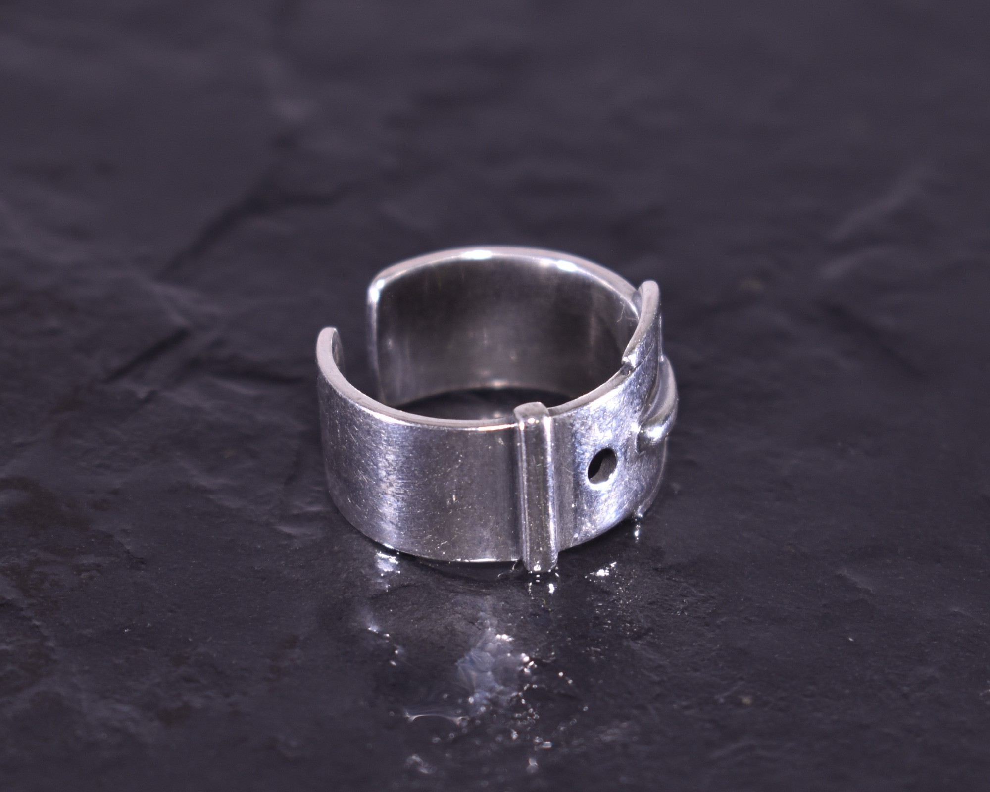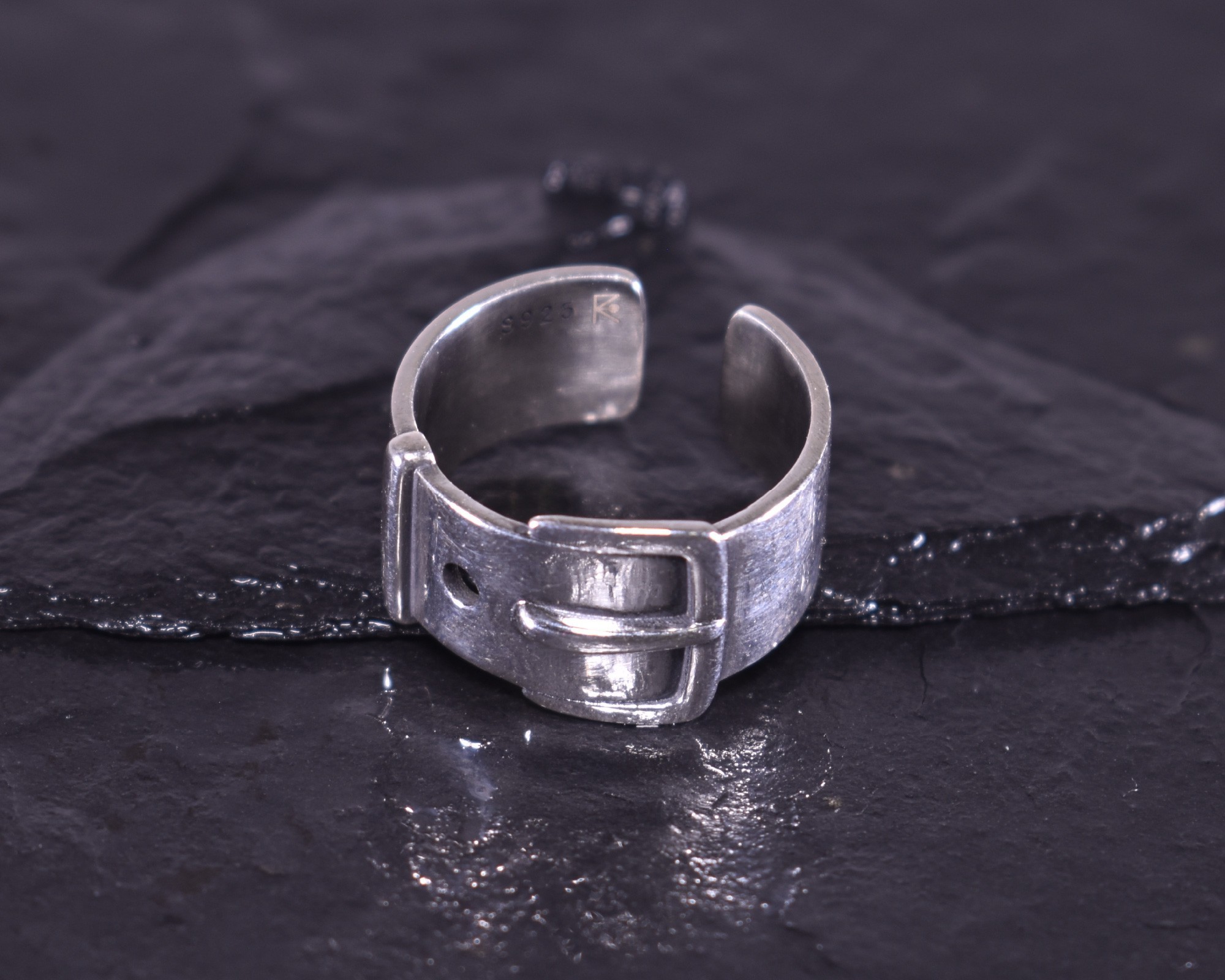 S ilberschnalle. Bei diesem offenen Silberring spricht das Design für sich. Die glattpolierten Details der Schnalle stehen in gutem Kontrast zum gebürsteten Ring. Ein Hingucker.