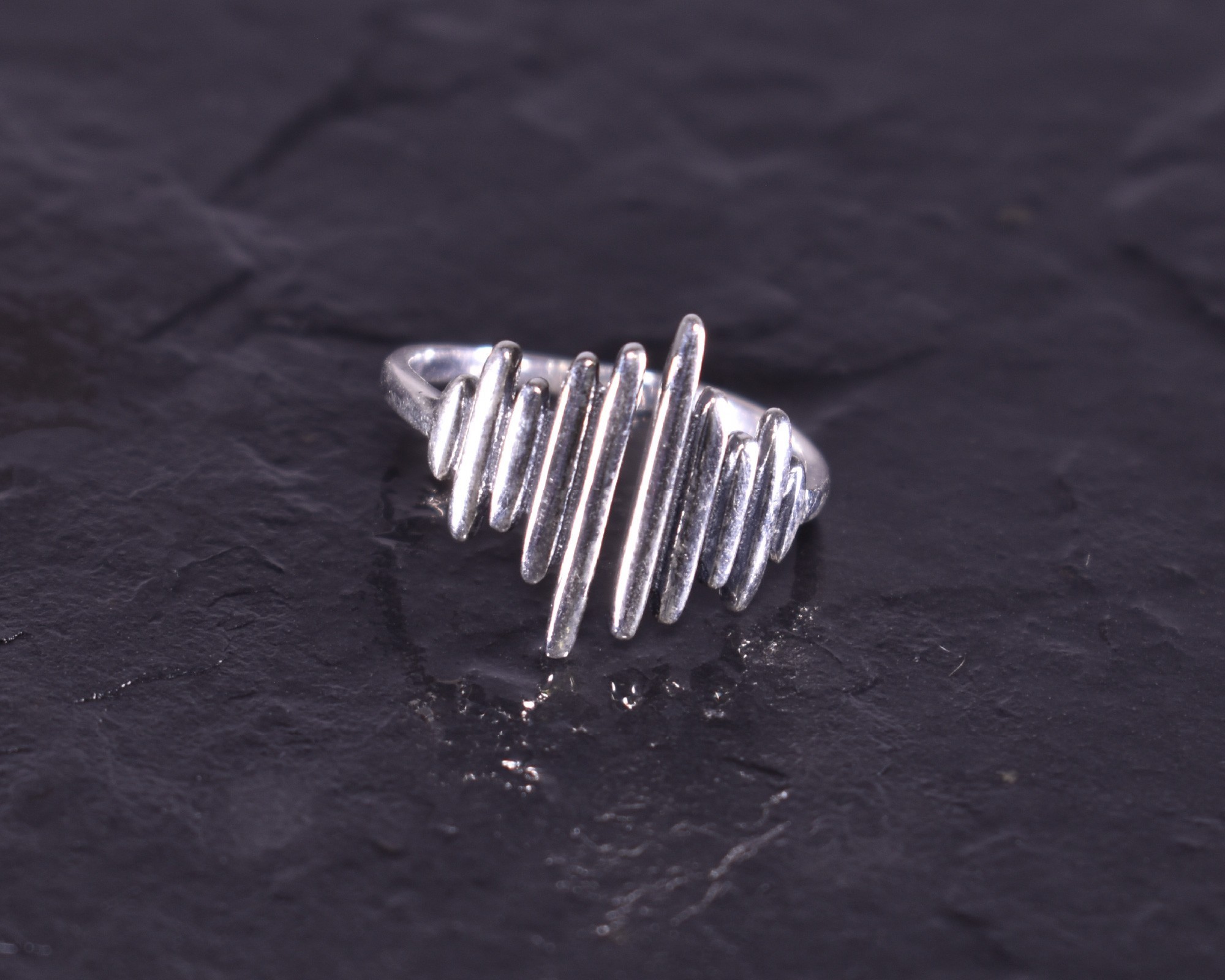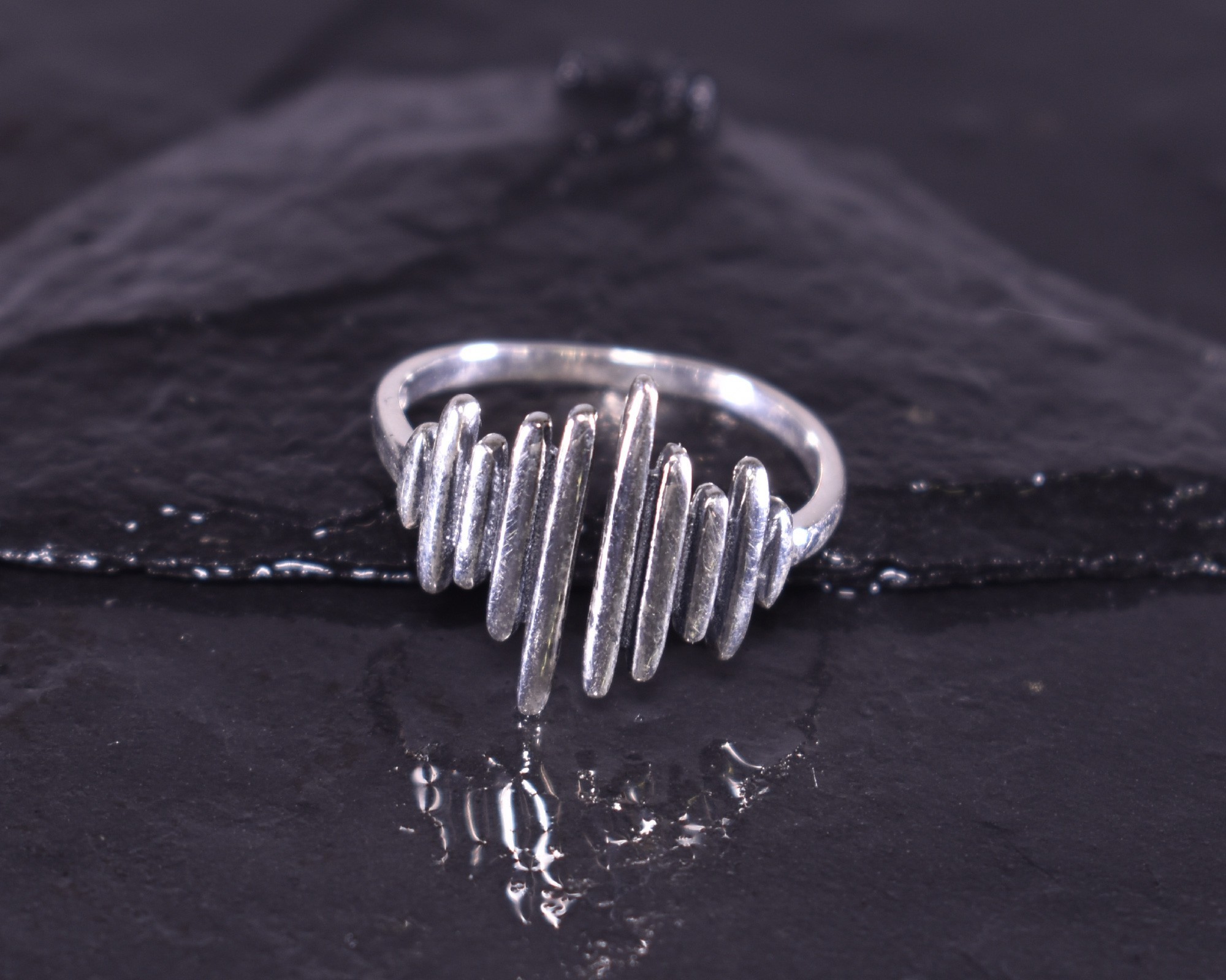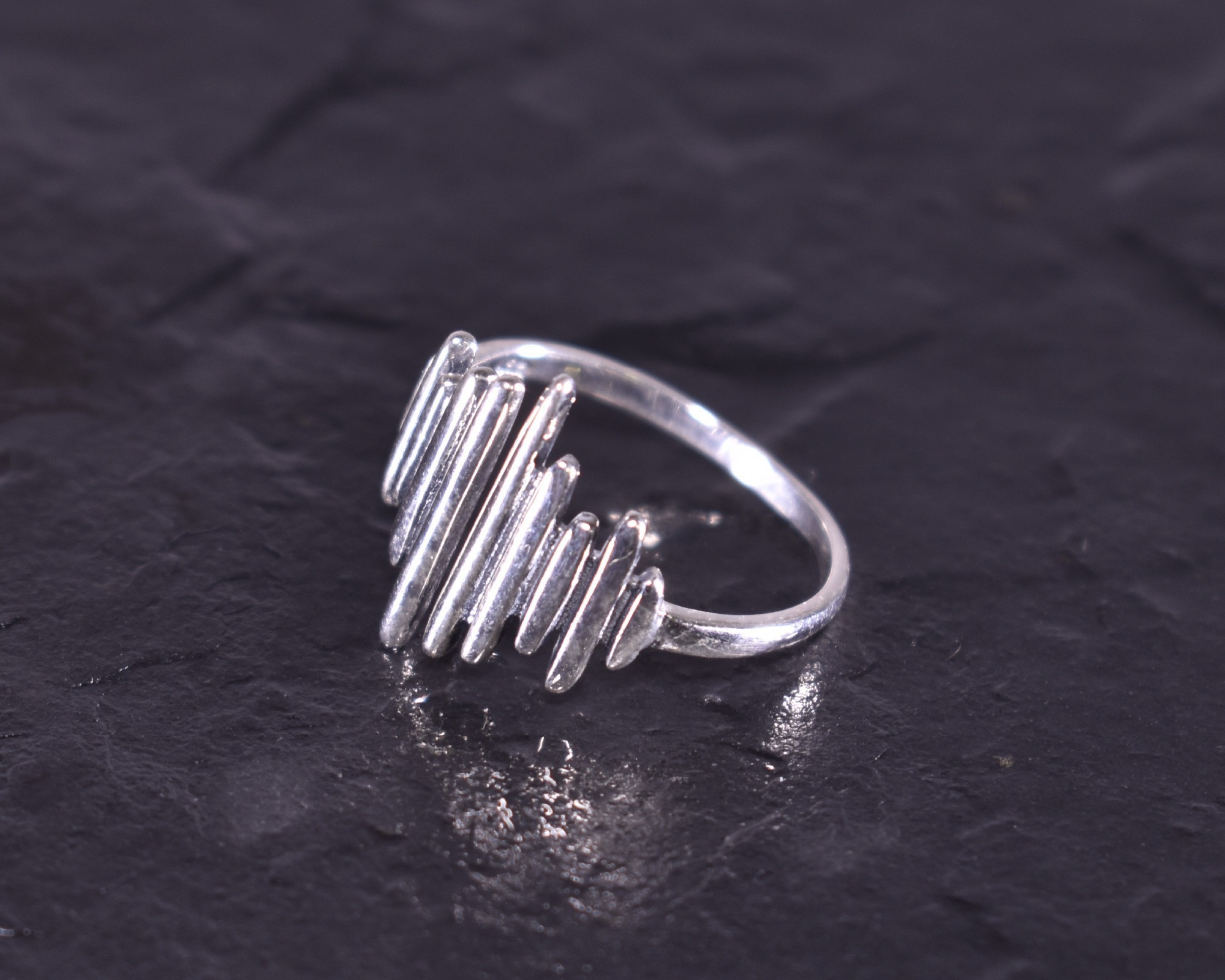 D ieser futuristische offene Silberring sticht mit seinem einzigartigen Design heraus. Die kunstvolle Anordnung der Silberstäbe in Form eines Balkendiagrammes bildet den Charakter des Ringes. Ein schönes Geschenk!