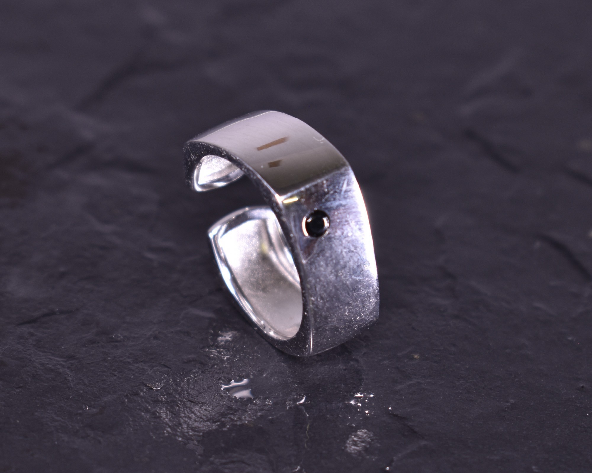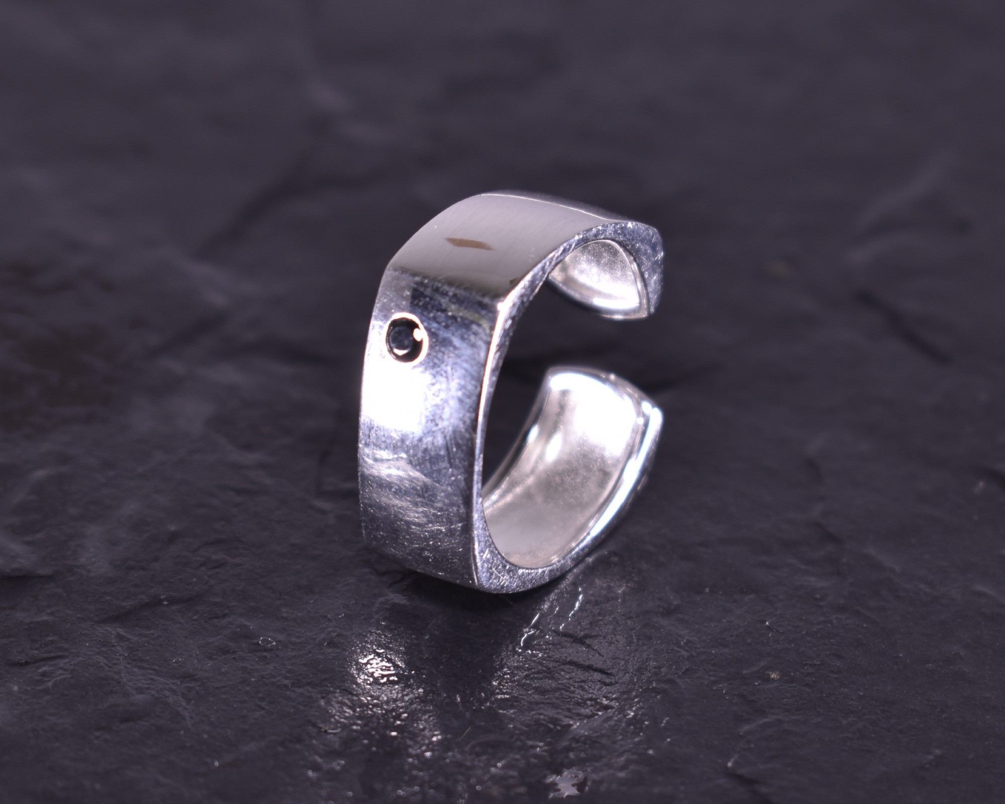 D ieser moderne androgyne offene Silberring überzeugt mit seinem Design. Die eckige Form dazu die glattpolierte Oberfläche lässt den Ring zeitlos bleiben. Enthält als Akzent einen schwarzen Edelstein.