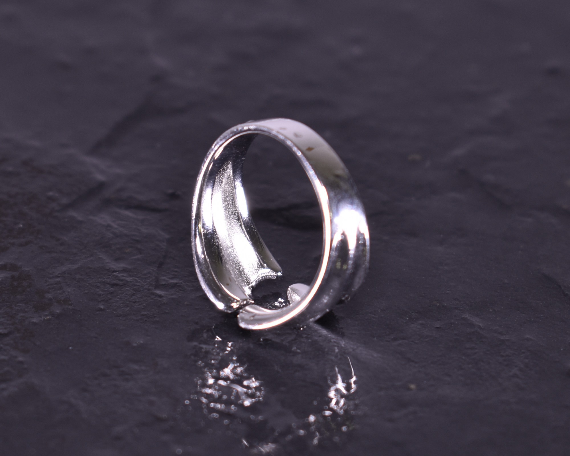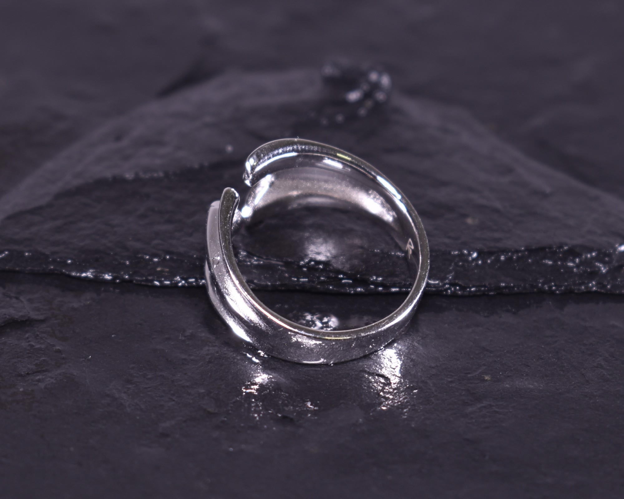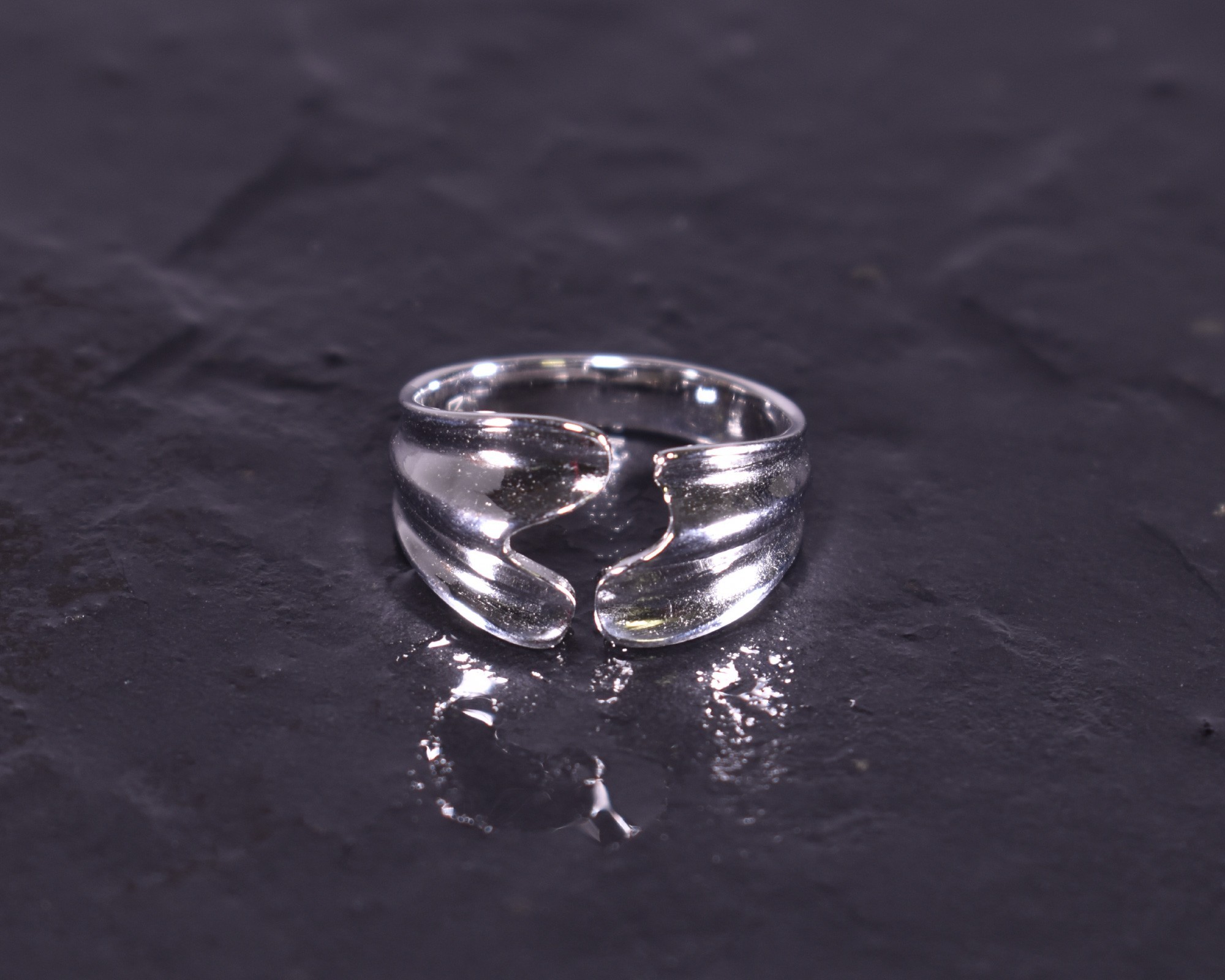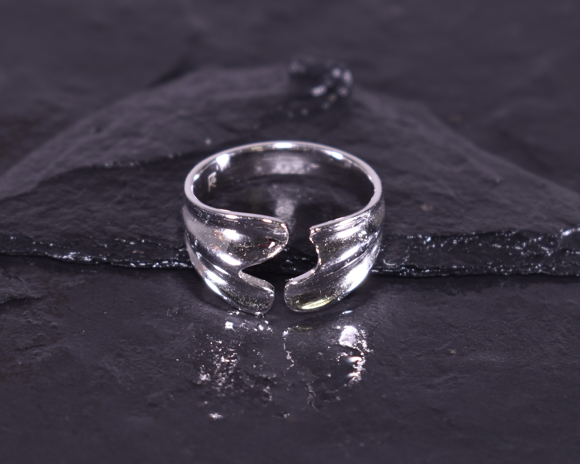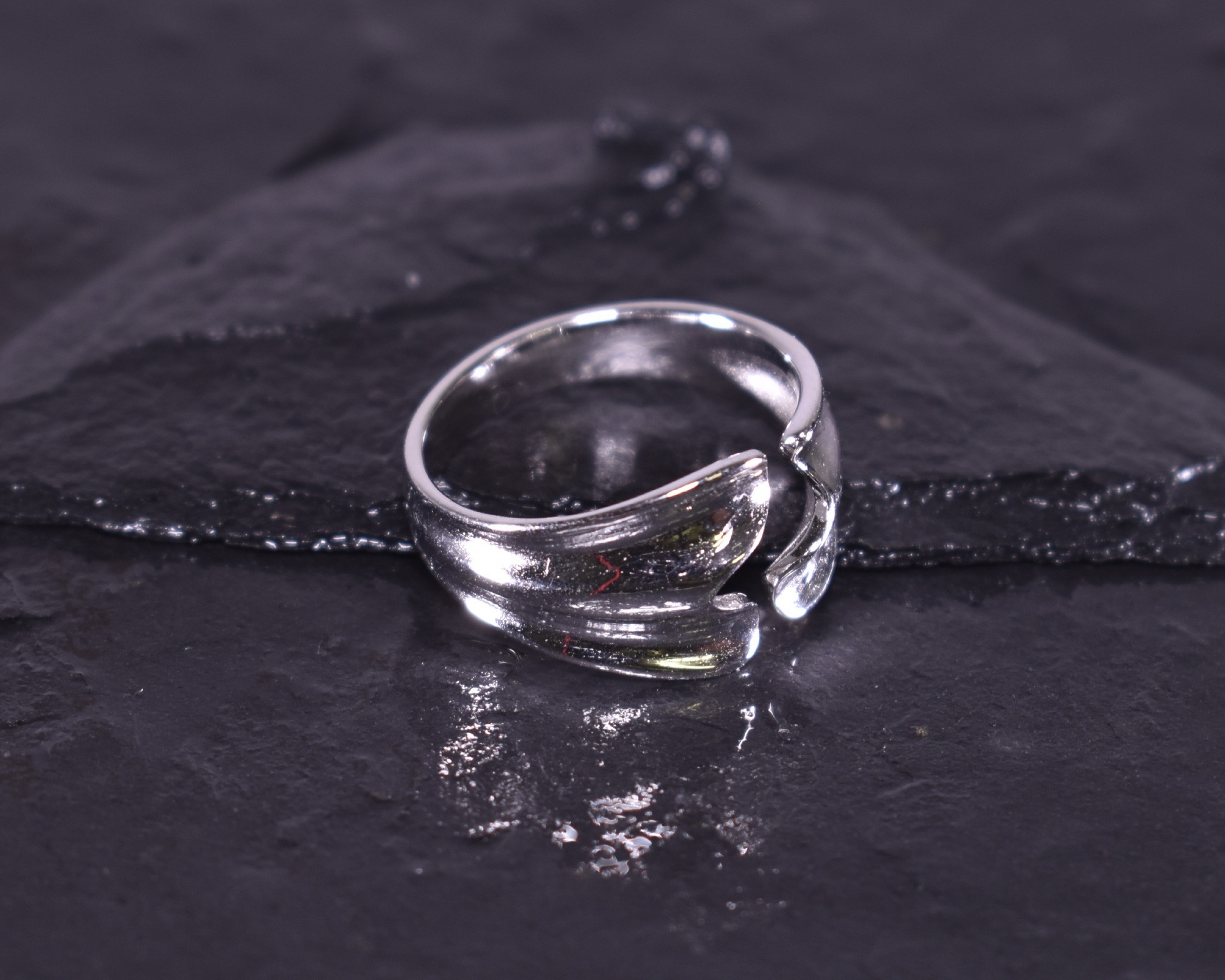 D ie Form ist das prägnanteste Merkmal dieses offenen Silberringes. Die zwei gegenüberliegenden geschwungenen Flossen bilden das kunstvolle Design. Die glattpolierte Oberfläche unterstreicht die schwungvolle Form.