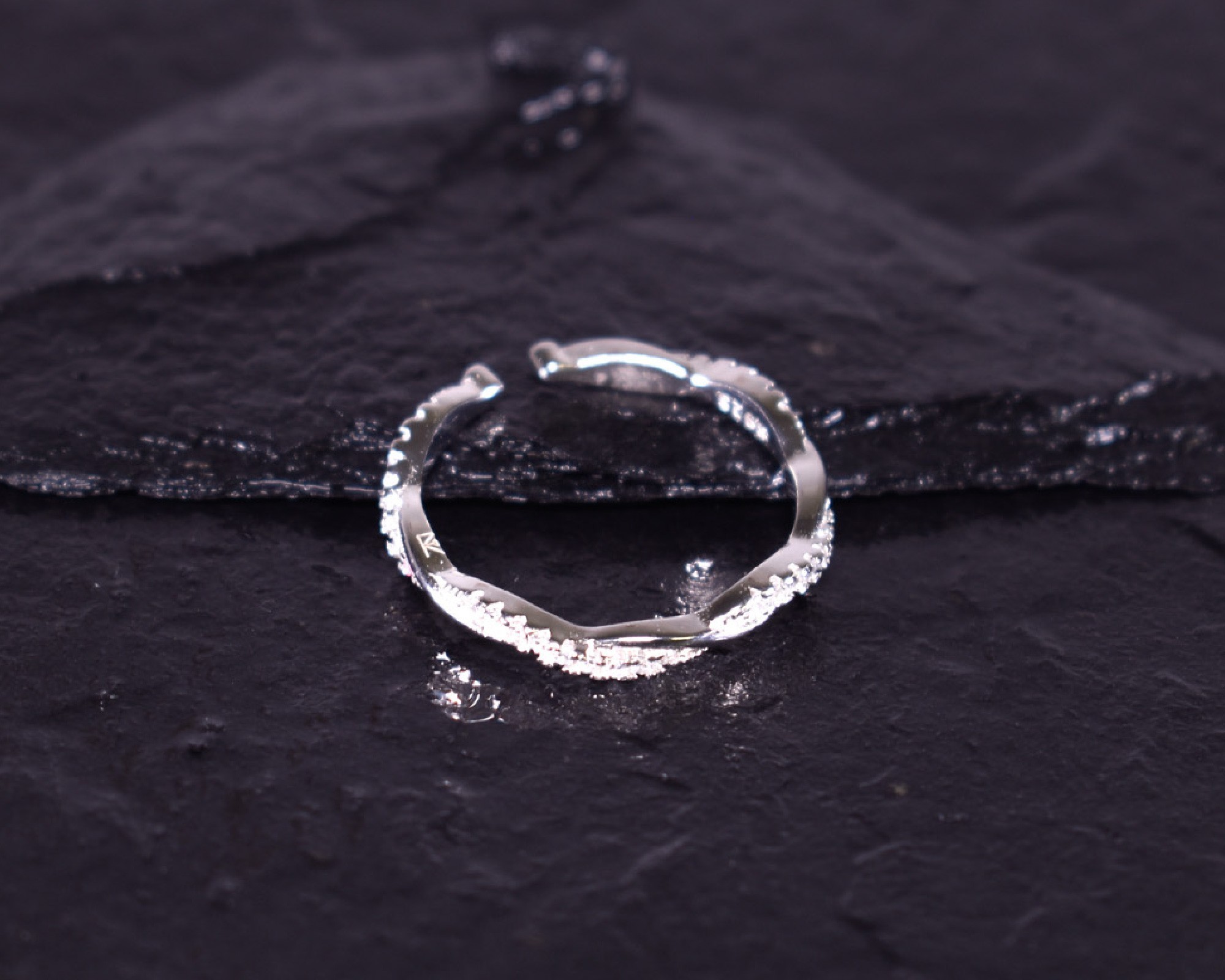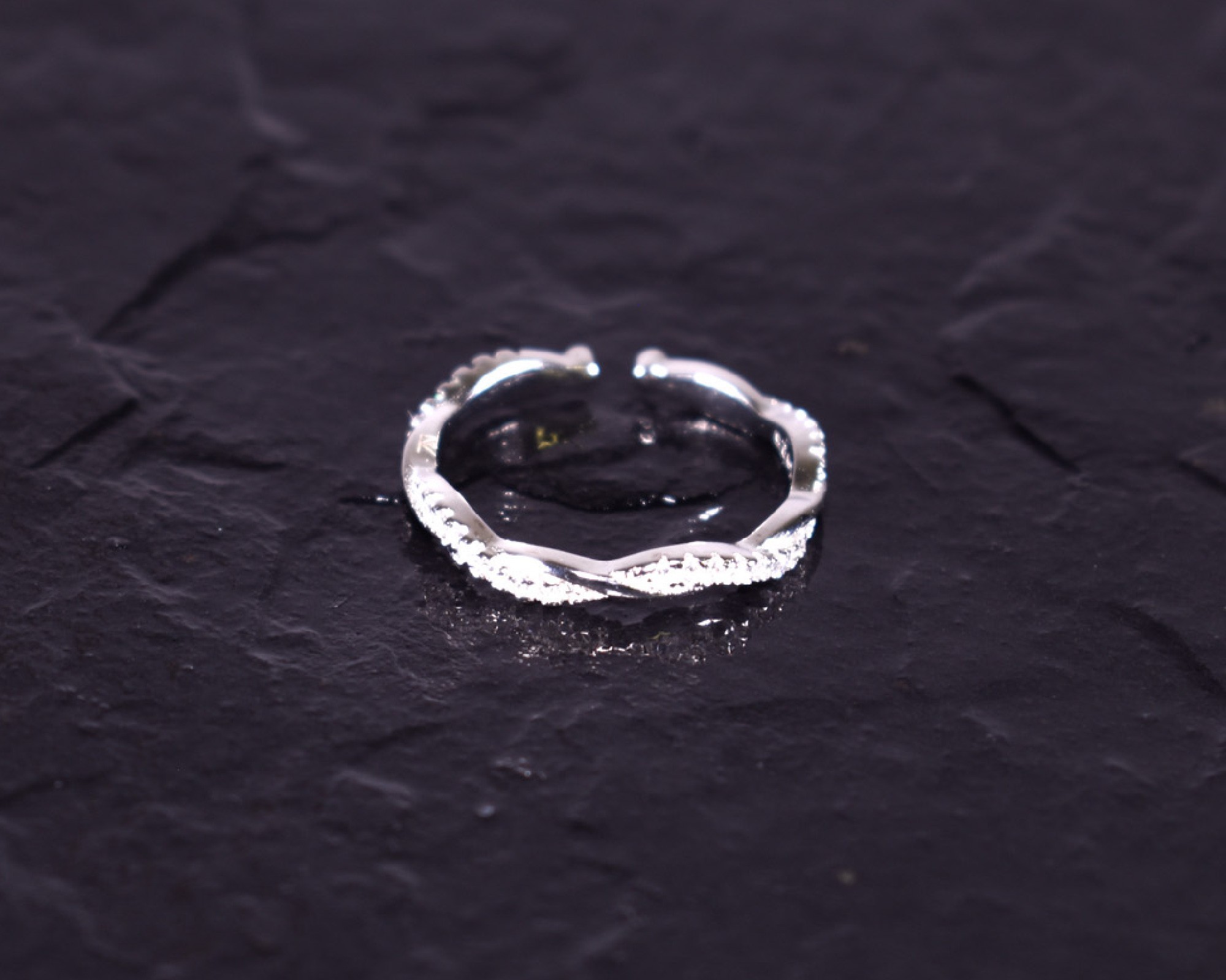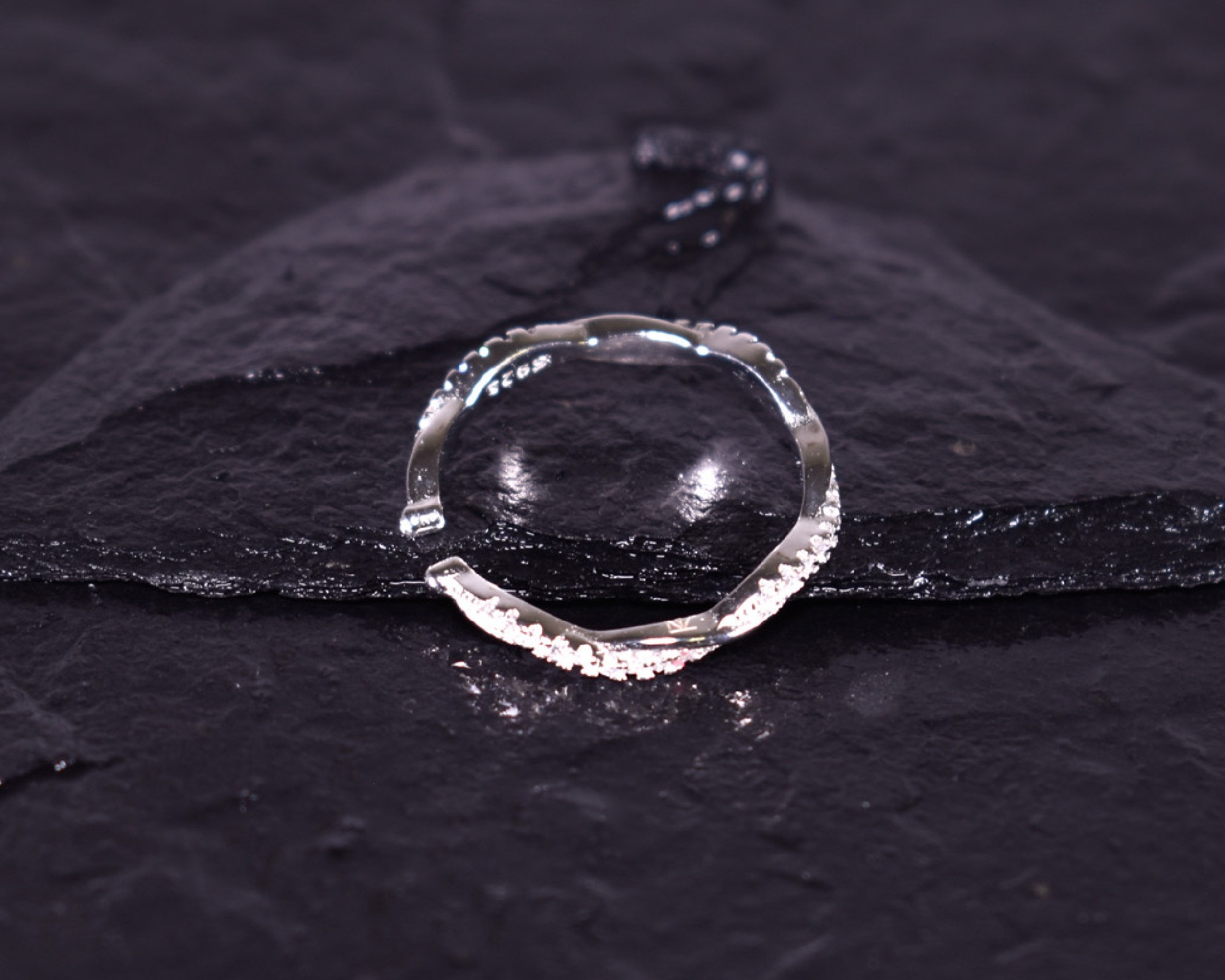 D ieser offene Silberring schmeichelt mit seinem glitzernden Steinen, welche eine der zwei gedrehten Linien bilden. Die gekordelte Form des Ringes verleiht diesem Schmuckstück das Gewisse Etwas.