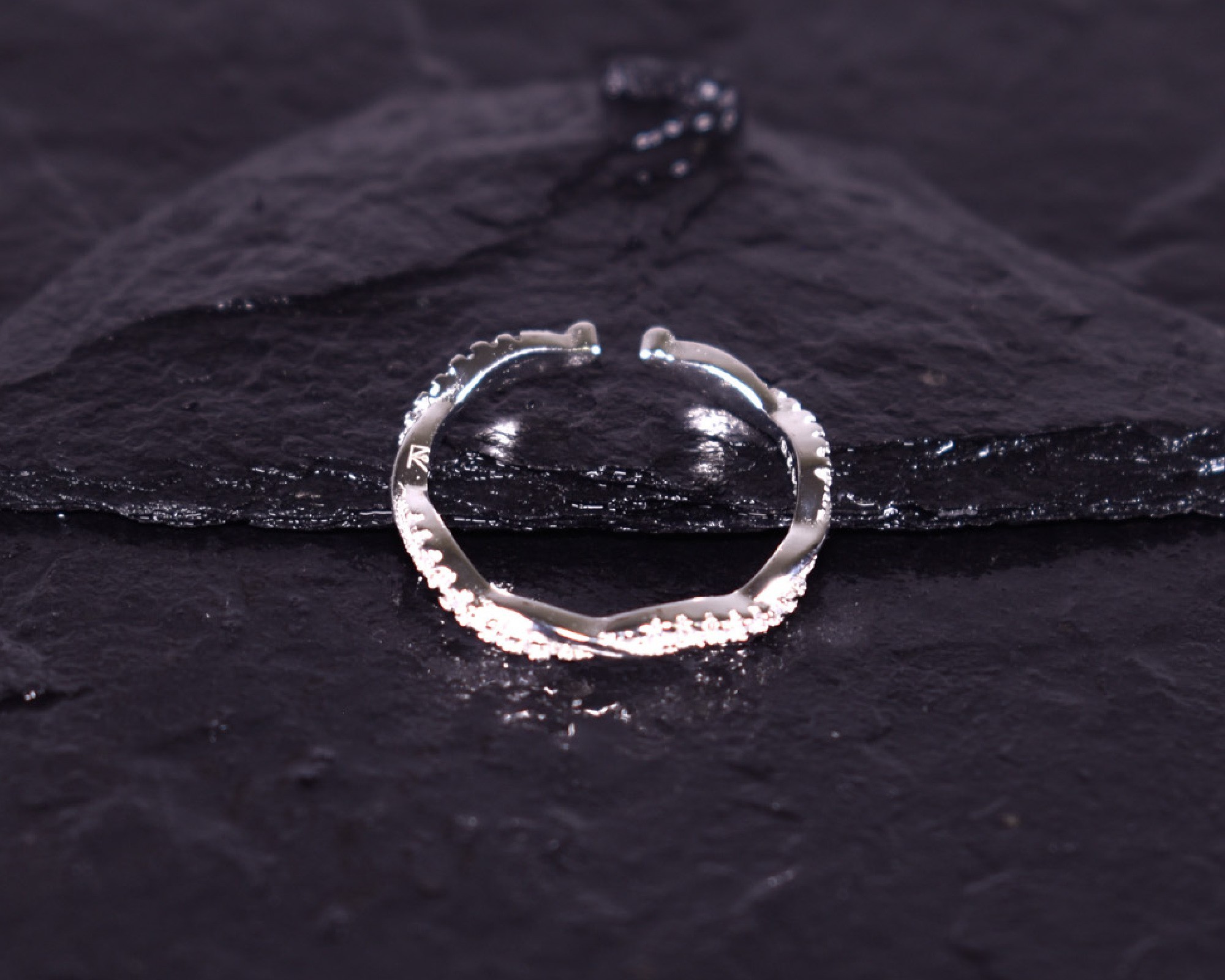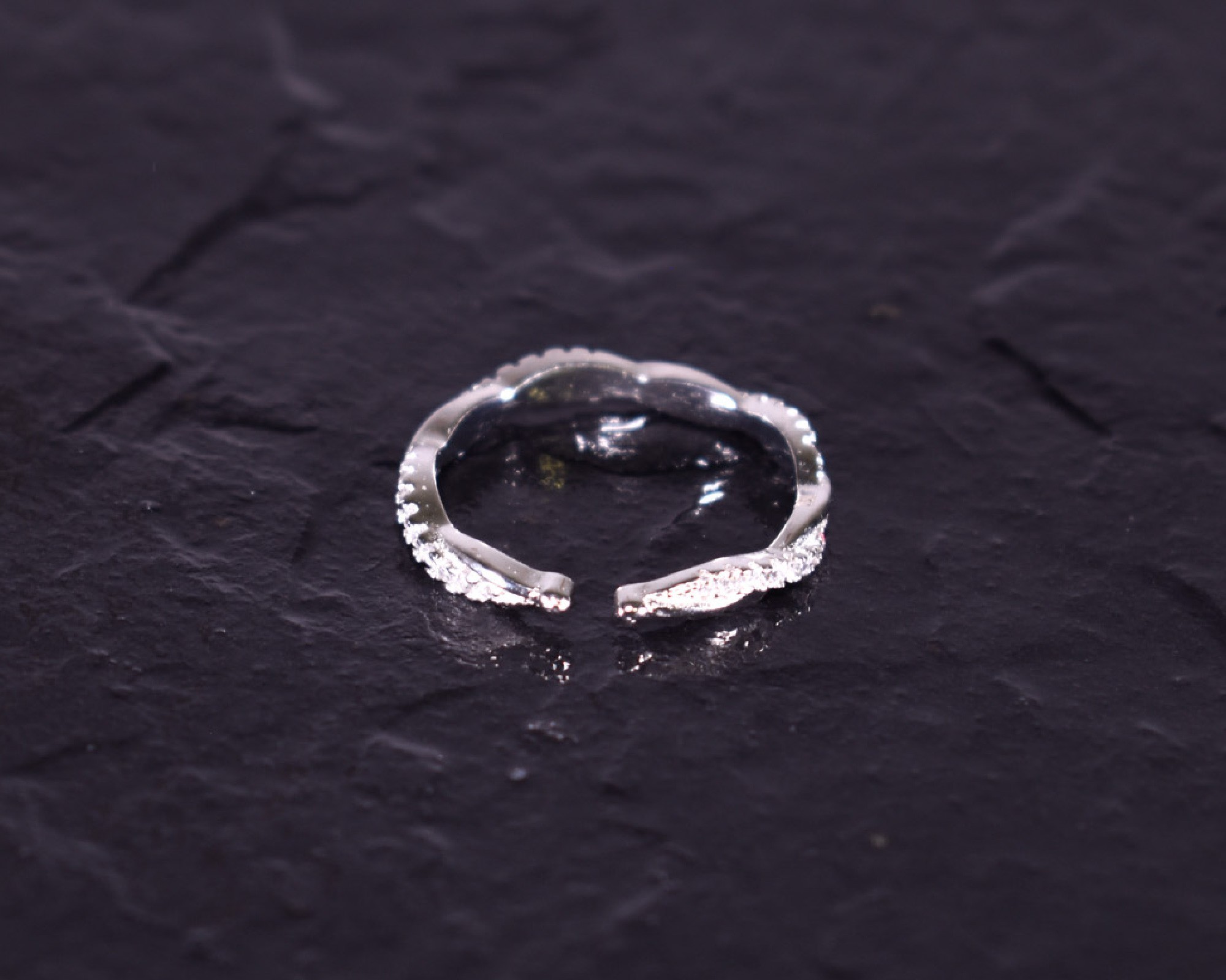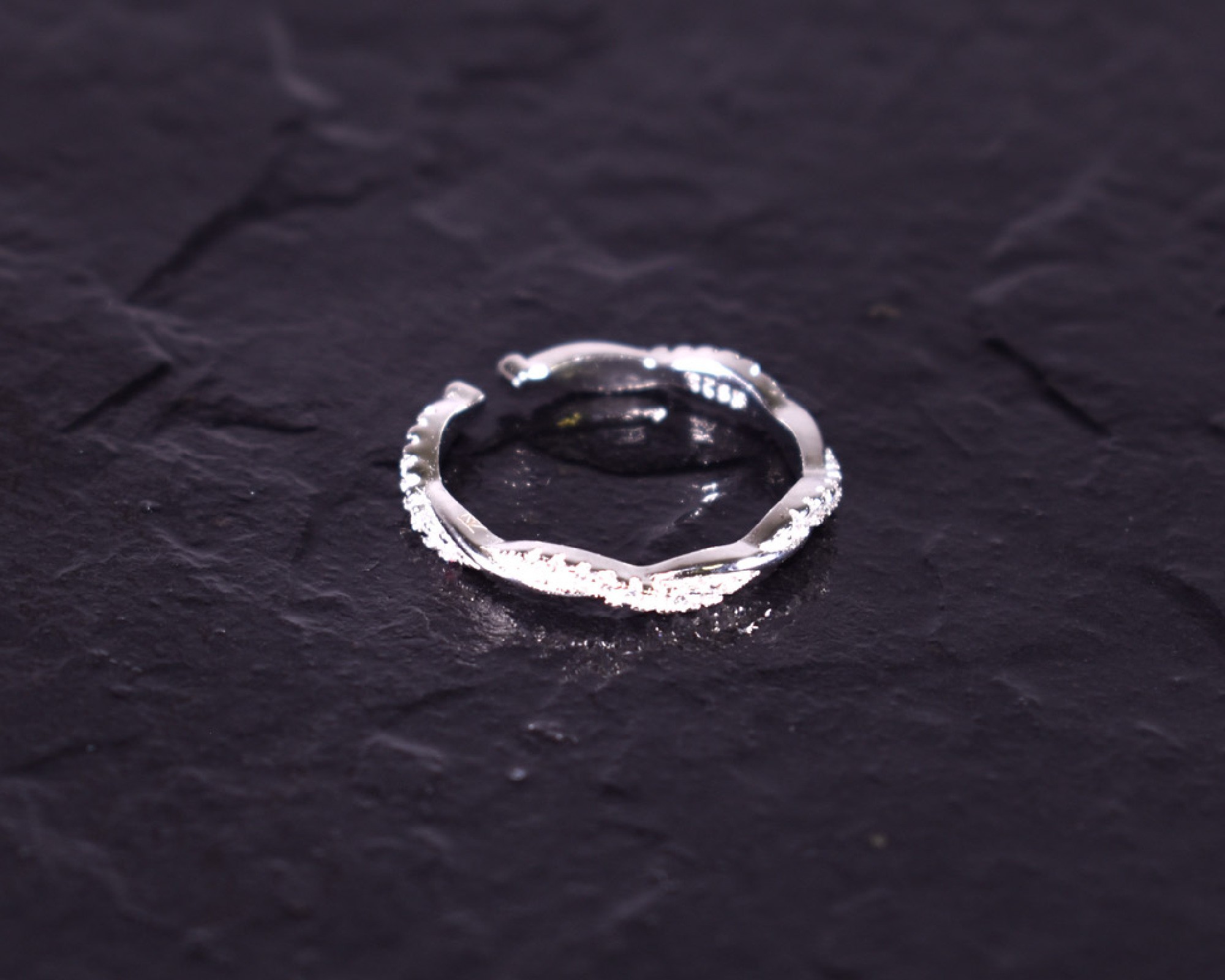 D ieser offene Silberring schmeichelt mit seinem glitzernden Steinen, welche eine der zwei gedrehten Linien bilden. Die gekordelte Form des Ringes verleiht diesem Schmuckstück das Gewisse Etwas.