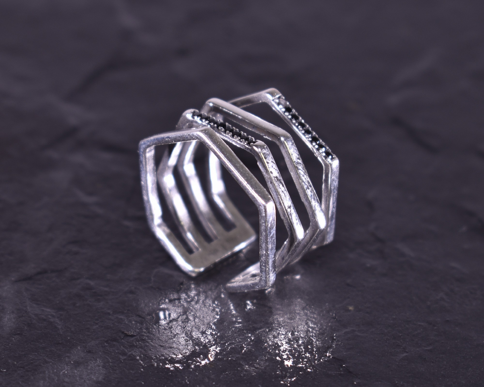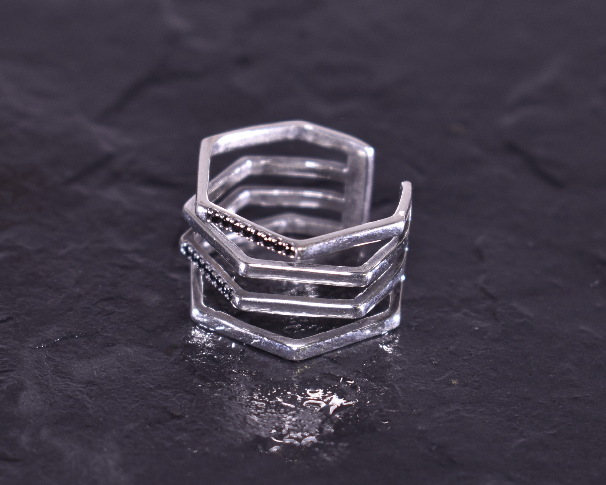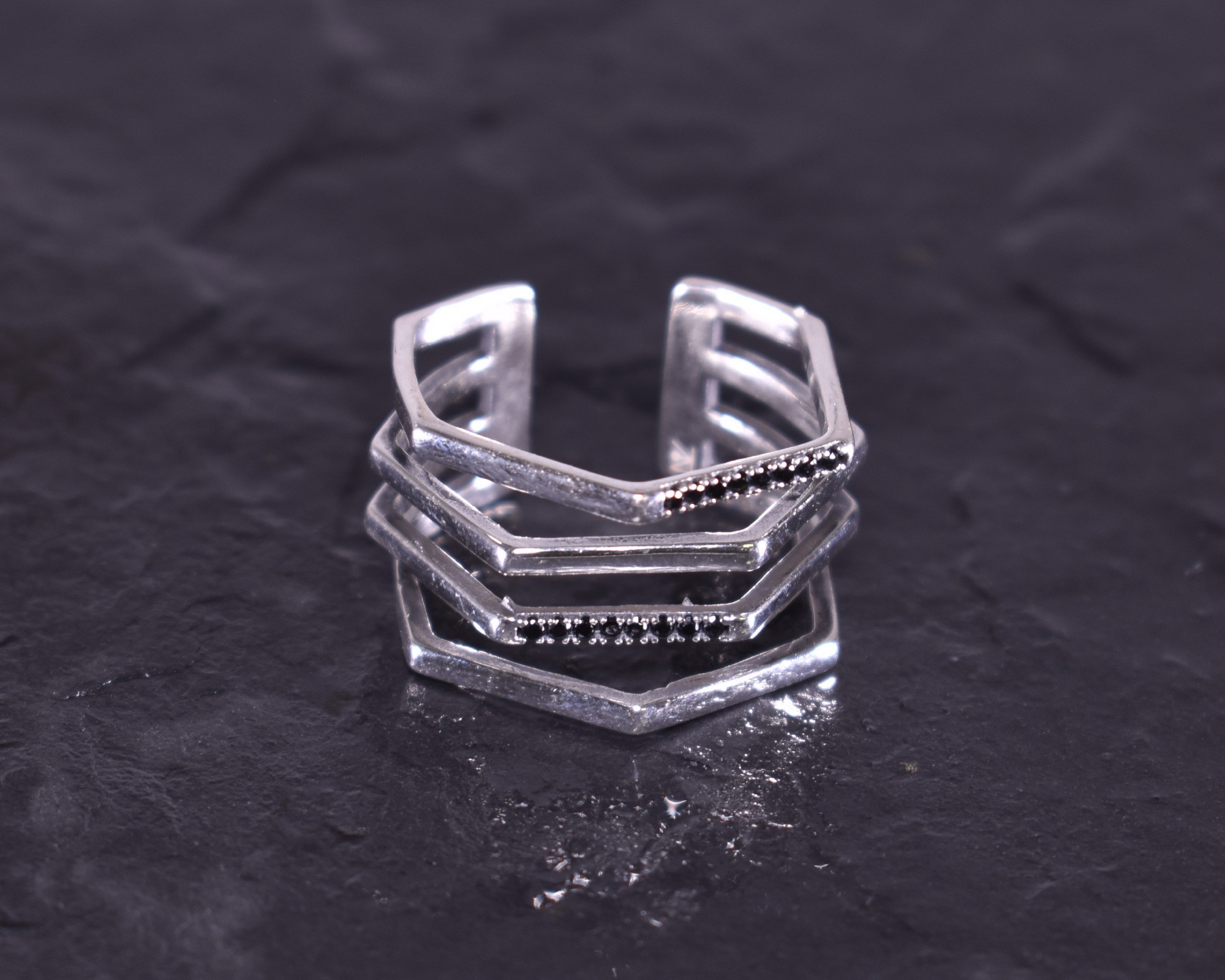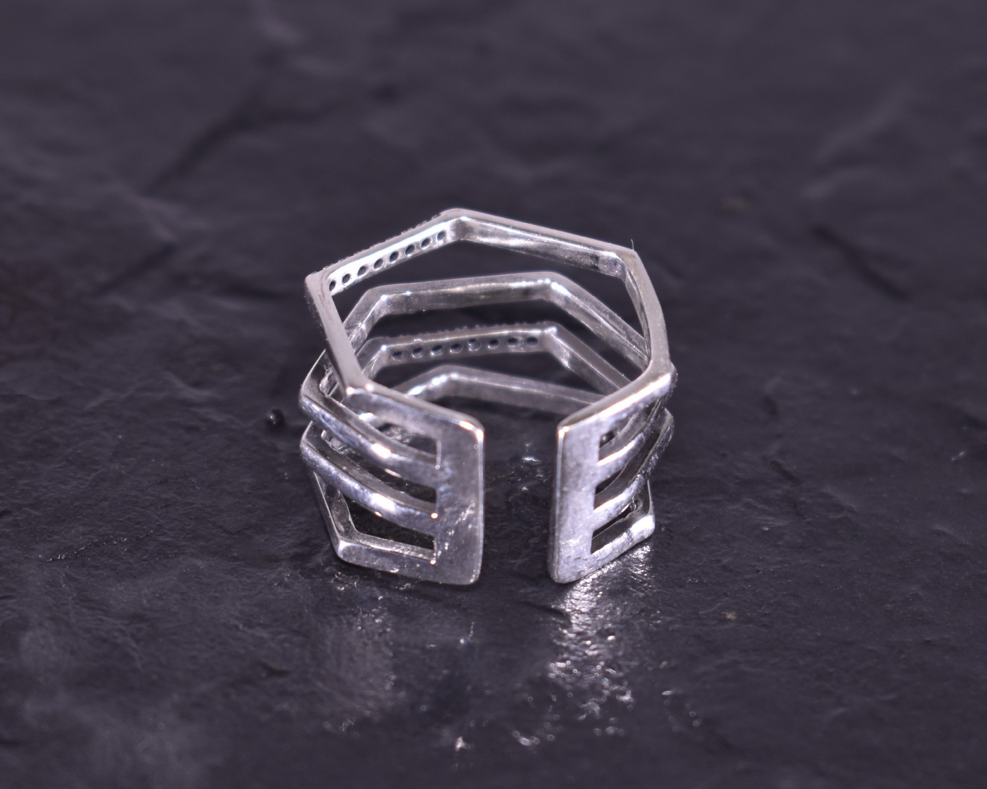 D eometrische Formen. Dieser offene Silberring bildet sich aus vier geometrisch künstlerisch geformten Ringen.