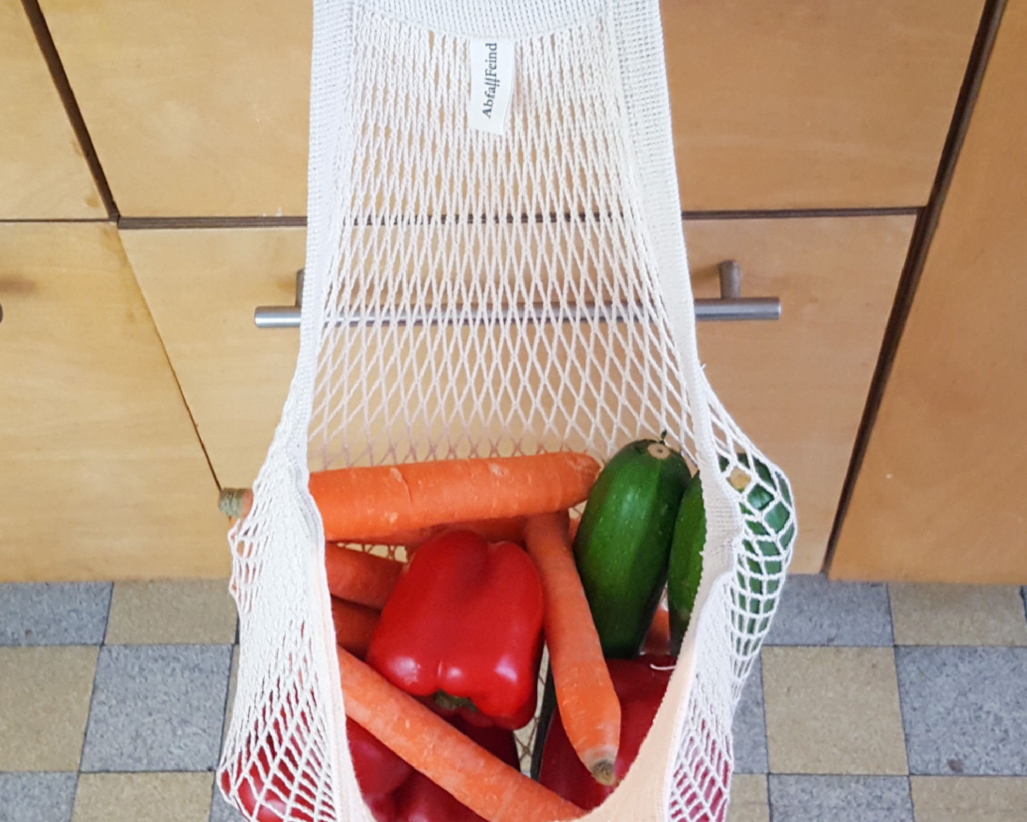 An der Schnur kannst du das Gemüse nach dem Einkauf überall aufhängen. Der atmungsaktive Baumwollstoff ist weitaus sinnvoller als Plastikobsttüten.
