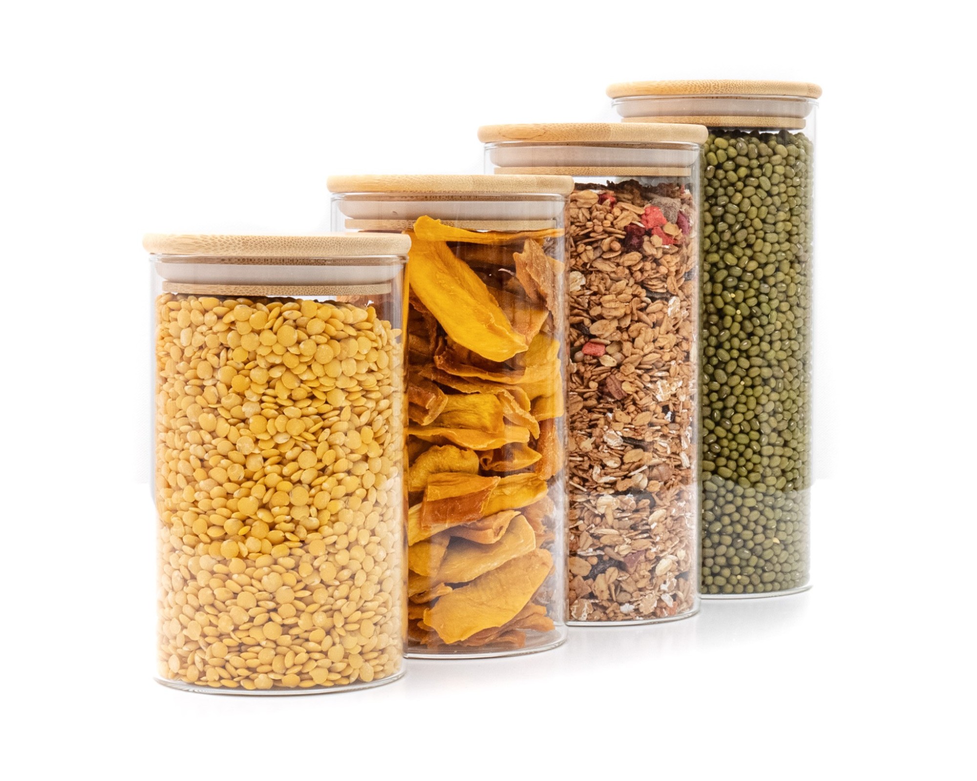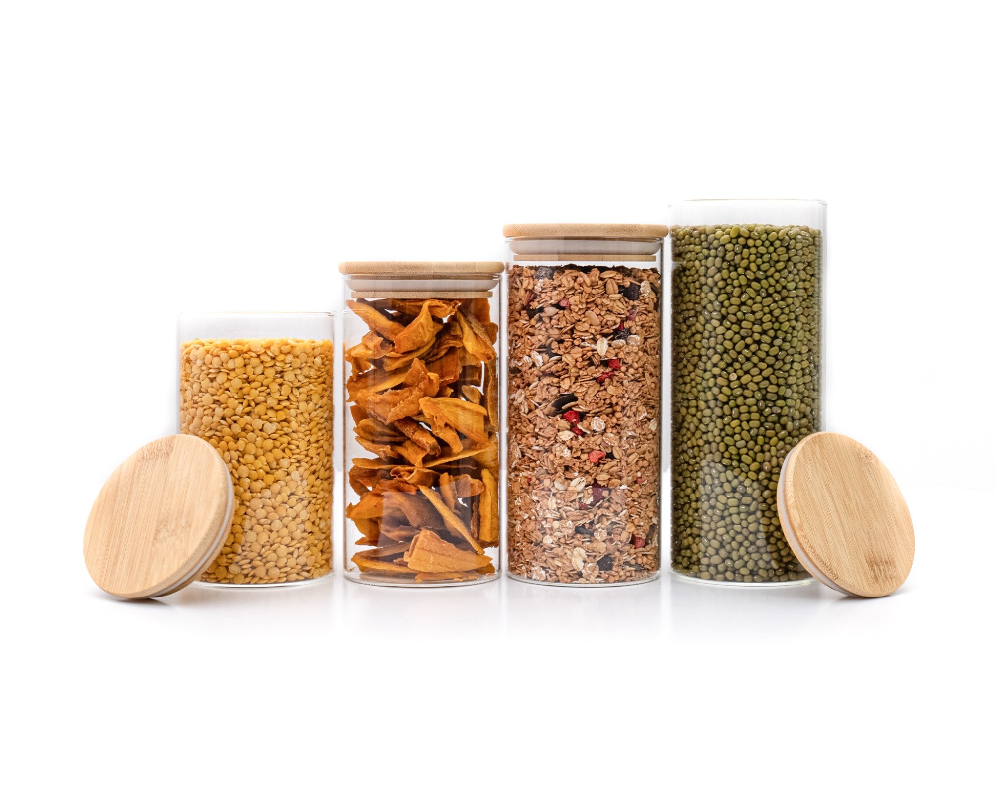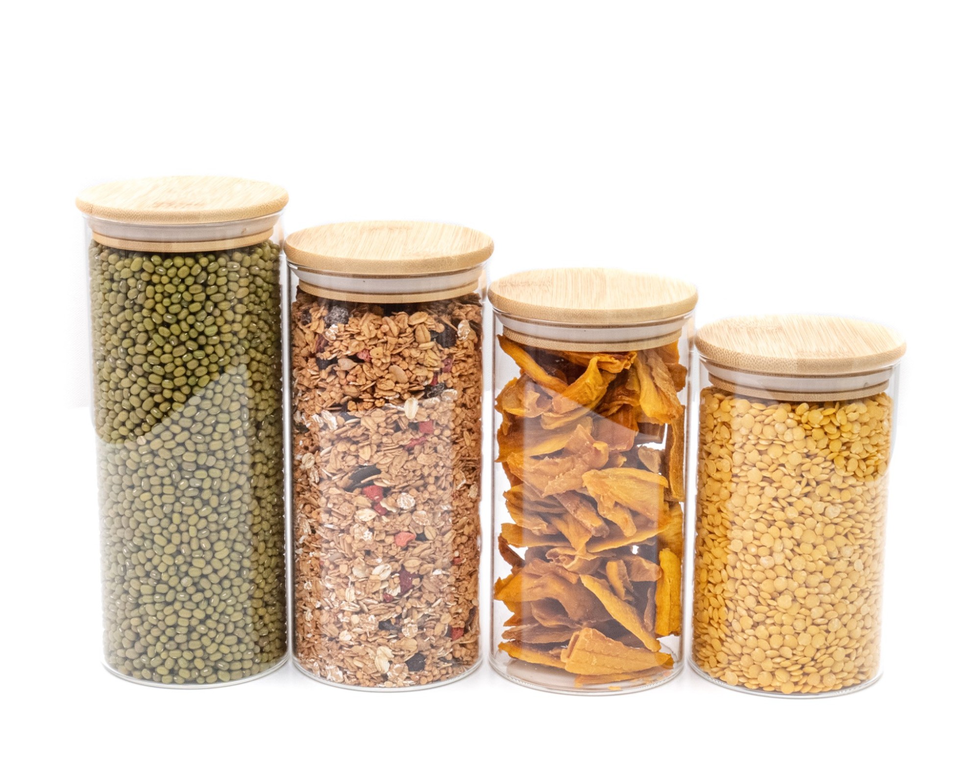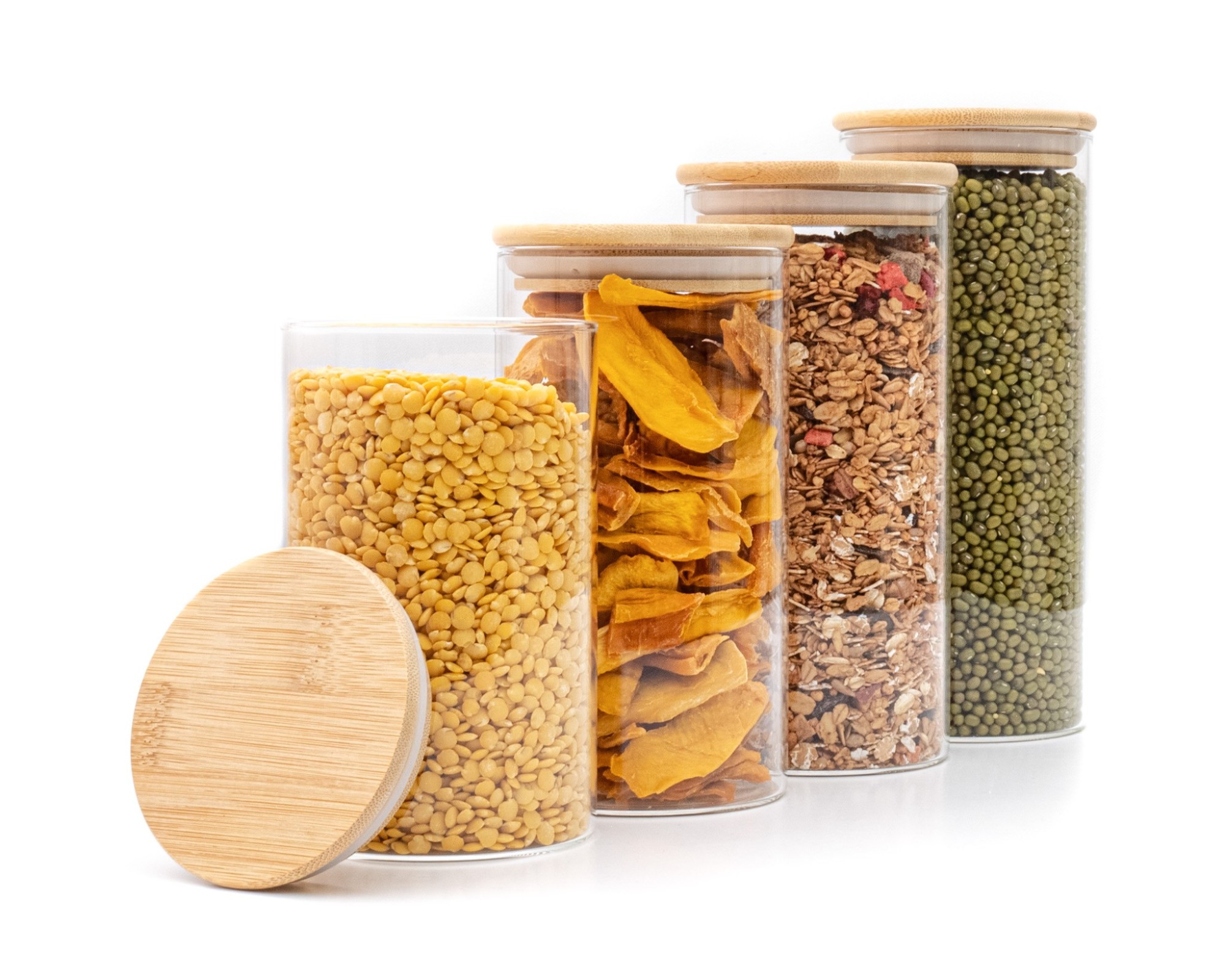 Le récipient en verre est en verre borosilicaté, le couvercle est en bois de bambou avec un anneau en silicone hermétique.