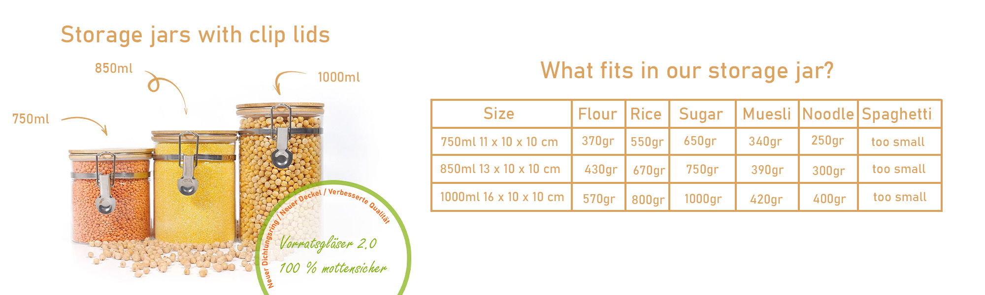Wir haben dieses Set bestellt, um unsere Küche besser zu organisieren, und es funktioniert hervorragend. Die Gläser sind robust, leicht zu reinigen und stapelbar. Der Clipverschluss macht sie absolut dicht. Für uns ein sehr gutes Preis-Leistungs-Verhältnis.