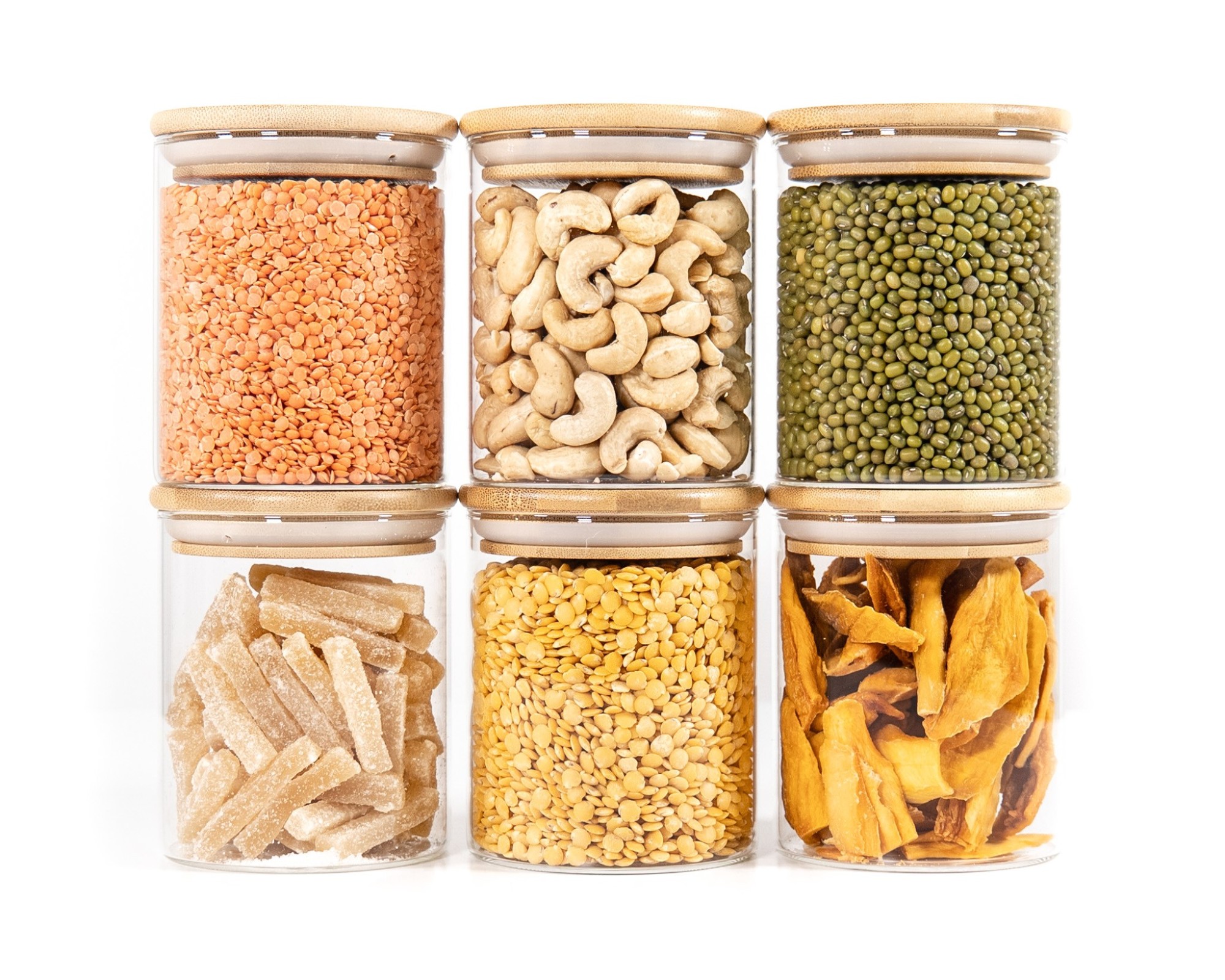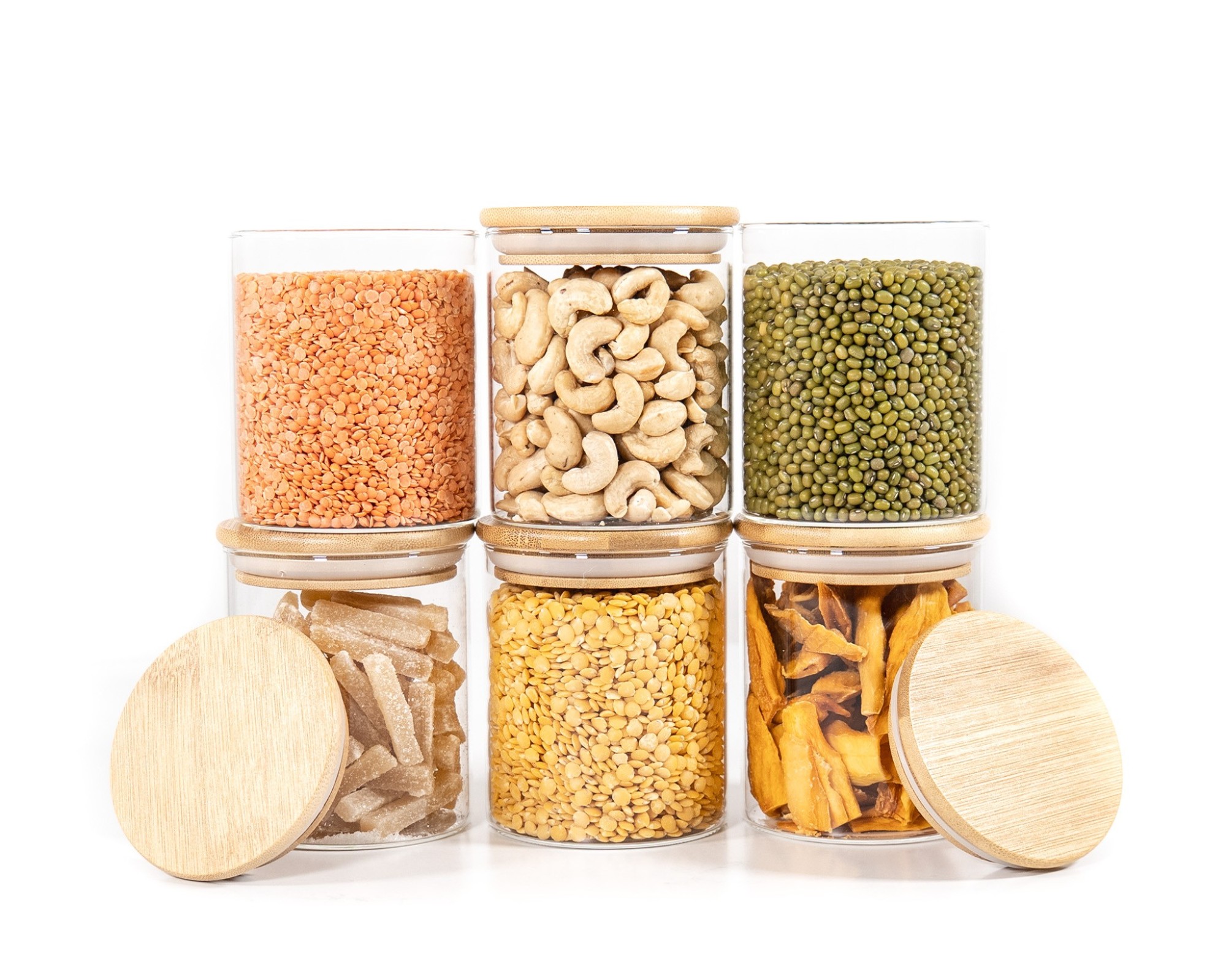 Stylish glass storage containers with round bamboo lids