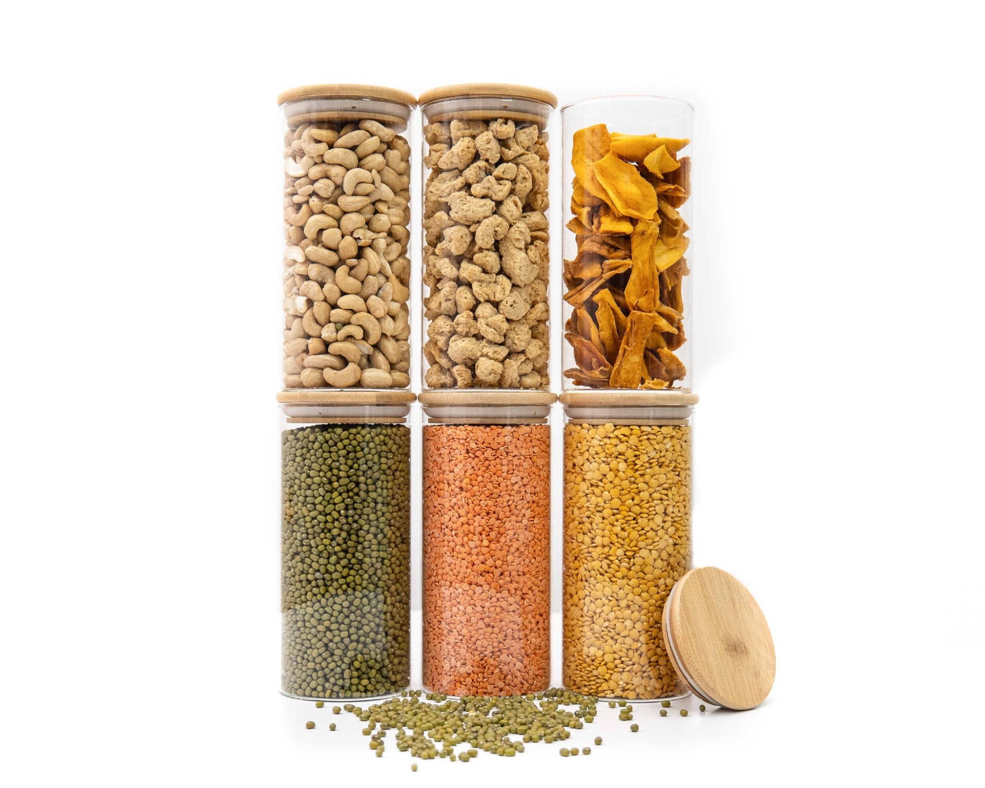 Stylish glass storage containers with round bamboo lids