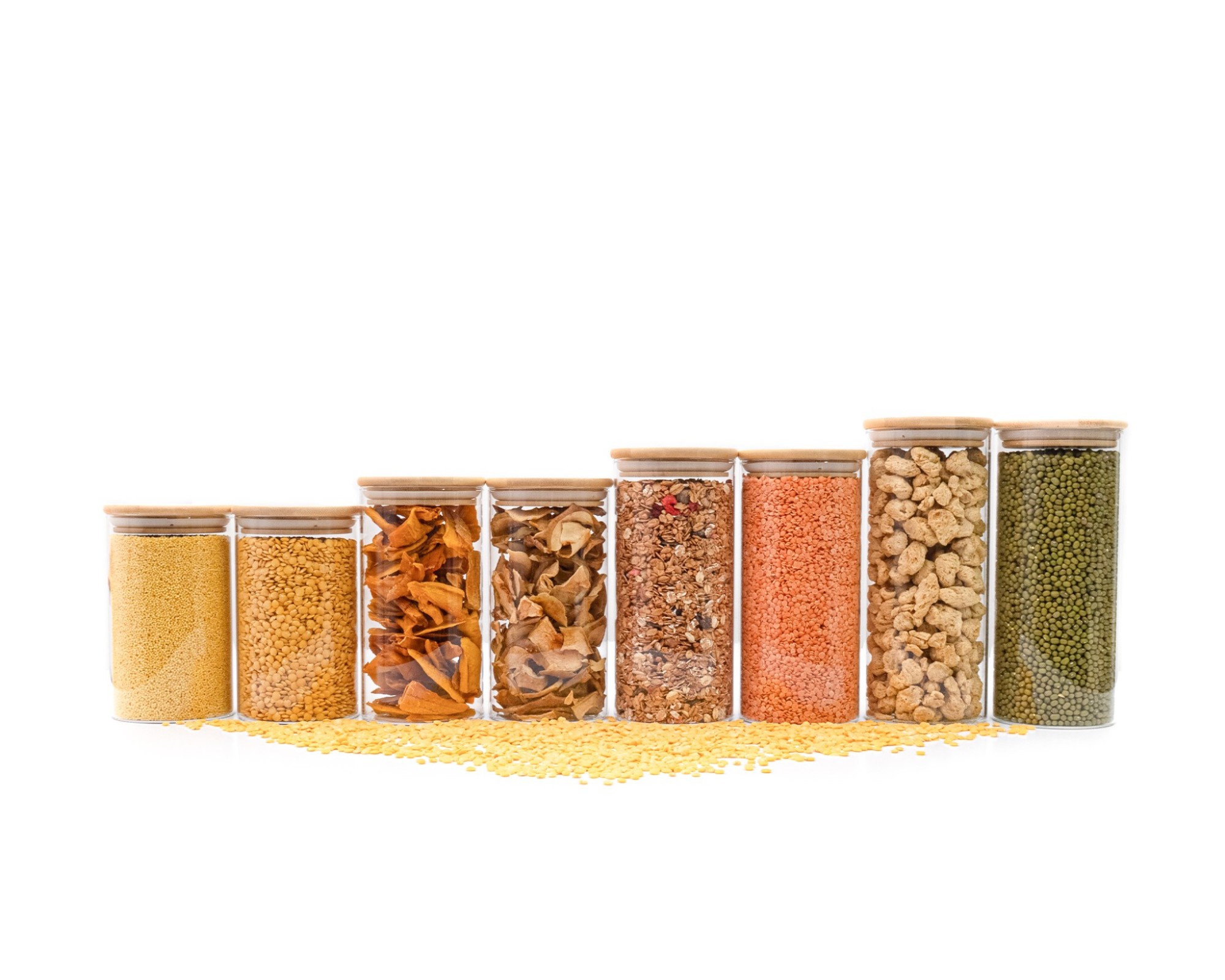 With these 8 narrow round storage jars (2 each with a volume of 700ml, 800ml, 1000ml and 1200ml) you can safely store your supplies all year round. The advantage of transparent storage jars is that you always know how your food is doing. Through the