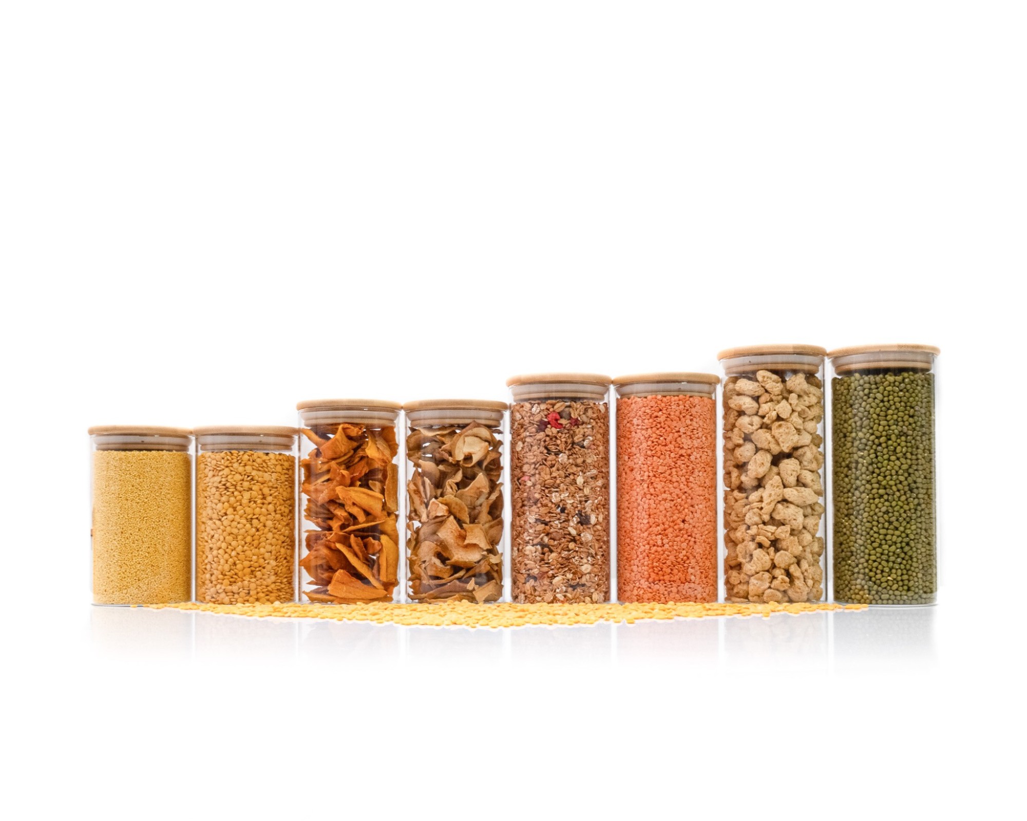 Stylish glass storage jars with round bamboo lids and 8cm diameter