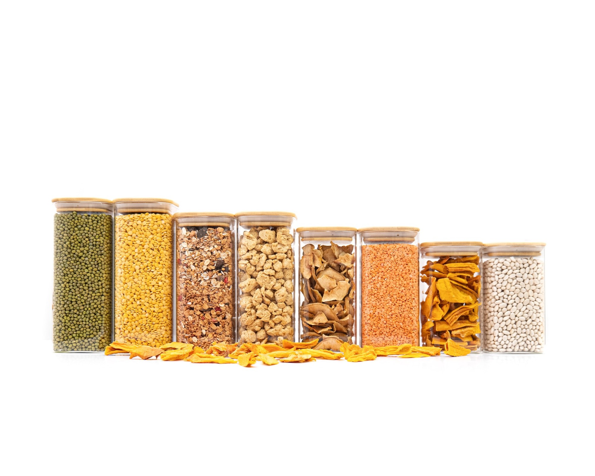 With these 8 narrow square storage jars (2 pieces each with a volume of 800ml, 900ml, 1050ml and 1200ml), you can safely store your supplies all year round. The advantage of transparent storage jars is that you always know how your food is doing