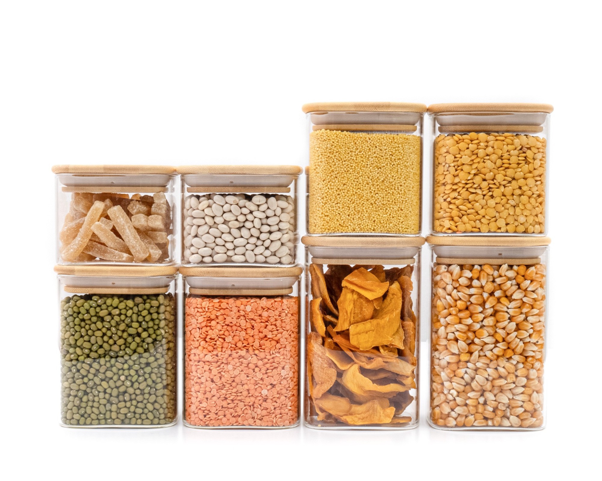 8 Sturdy glass containers with 4 different heights (6cm, 8cm, 10cm and 12cm, each 1cm higher with lid)