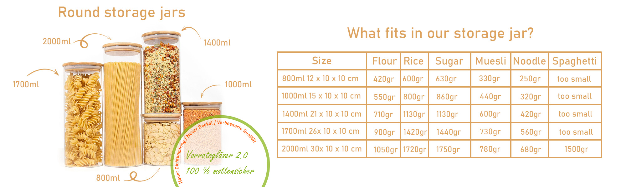 Auch nach mehrfacher Nutzung sind keine Abnutzungserscheinungen zu sehen. Die Dichtungsringe schliessen sehr gut ab und wirken langlebig. Die Bambusdeckel sind hochwertig verarbeitet und frei von Kratzern. Das Material fühlt sich hochwertig an und wirkt robust. Als kleine Überraschung lag ein Extra-Glas bei, weil wir mehrere Artikel bestellt hatten. Die Gläser sind wirklich absolut luftdicht, keine Motten oder andere Tiere kommen hinein.