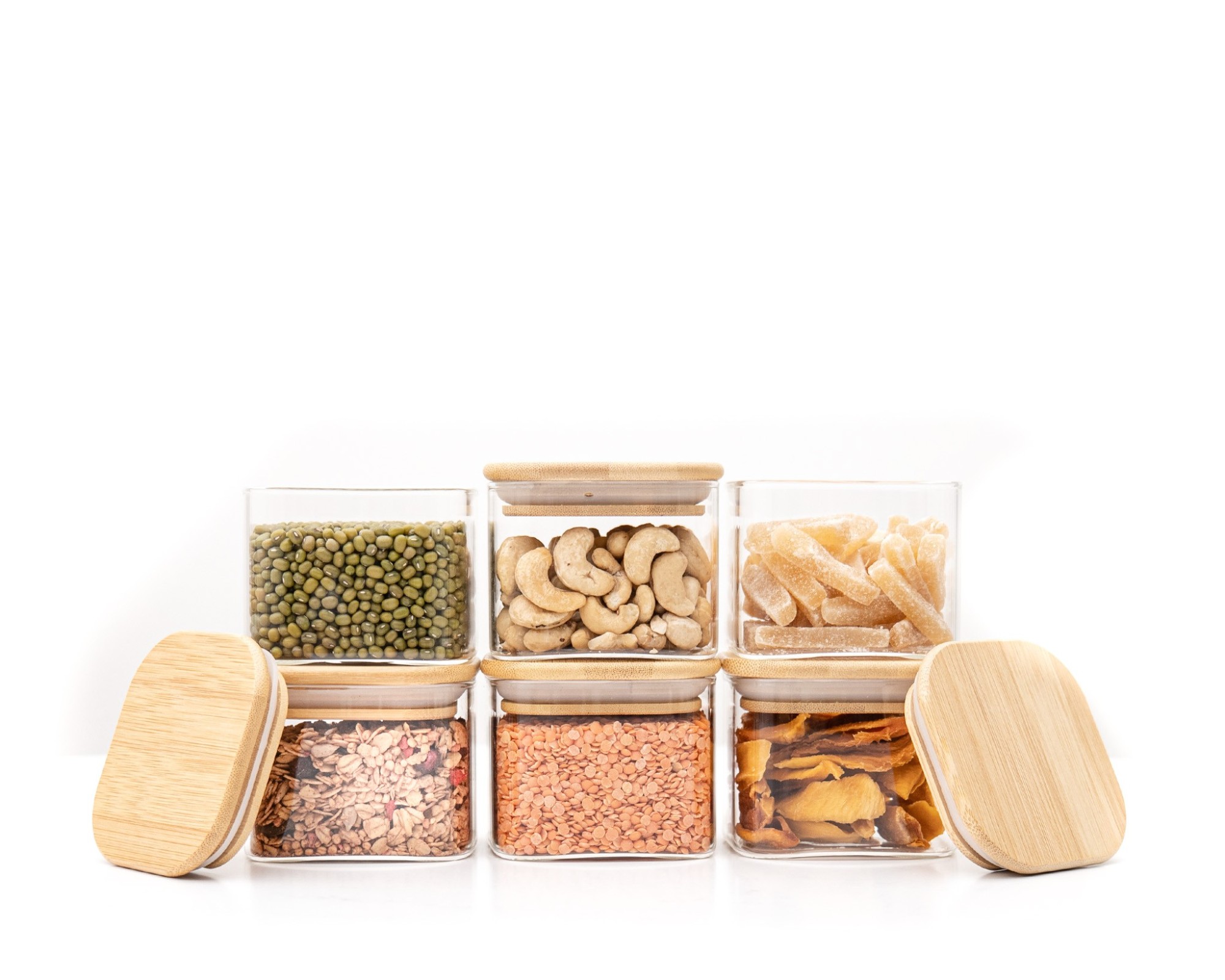 Eleganti contenitori in vetro con coperchi quadrati in bambù