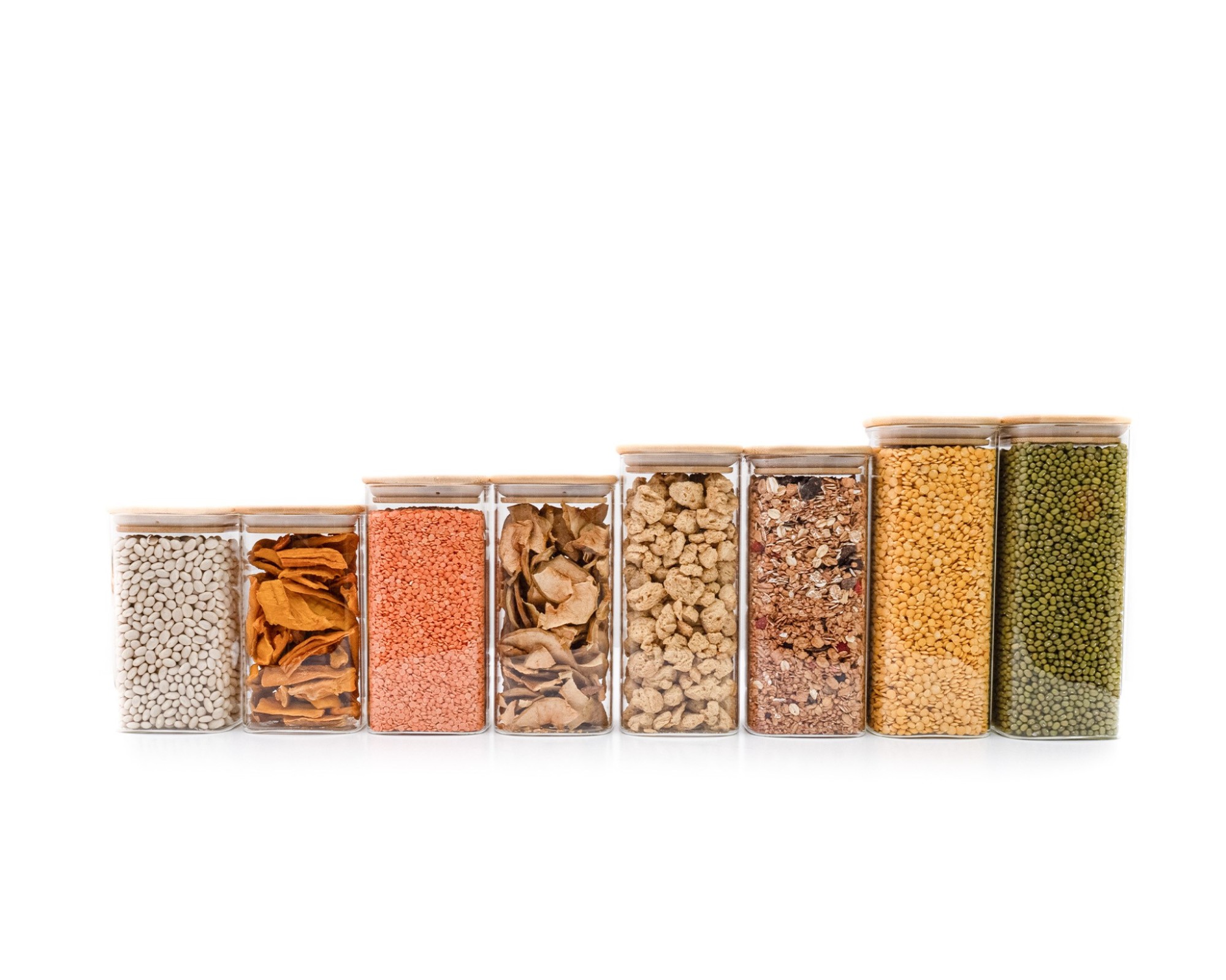 8 Contenitori robusti in vetro con 4 diverse altezze (14 cm, 16 cm, 18 cm e 20 cm, ciascuno con coperchio 1 cm più alto)