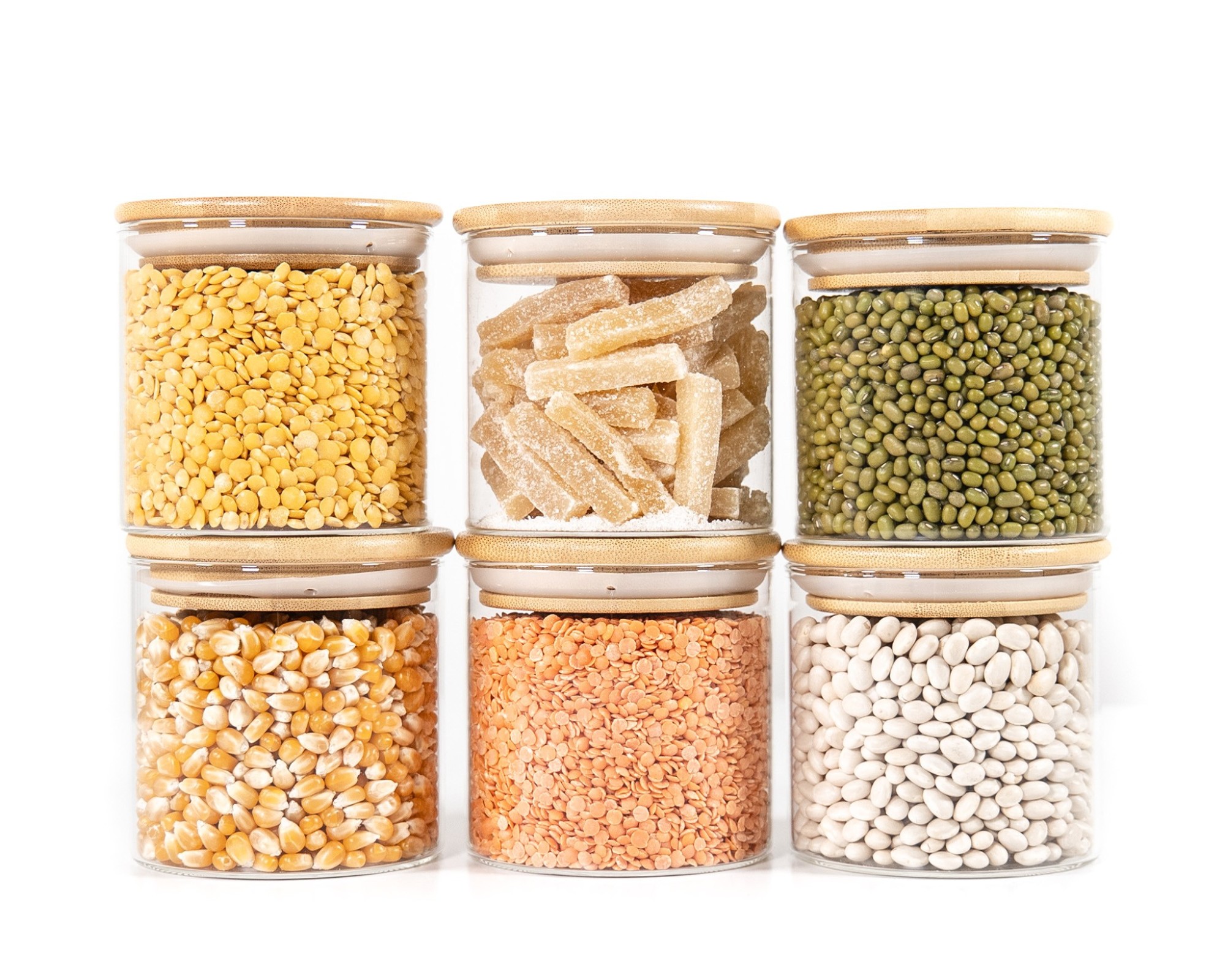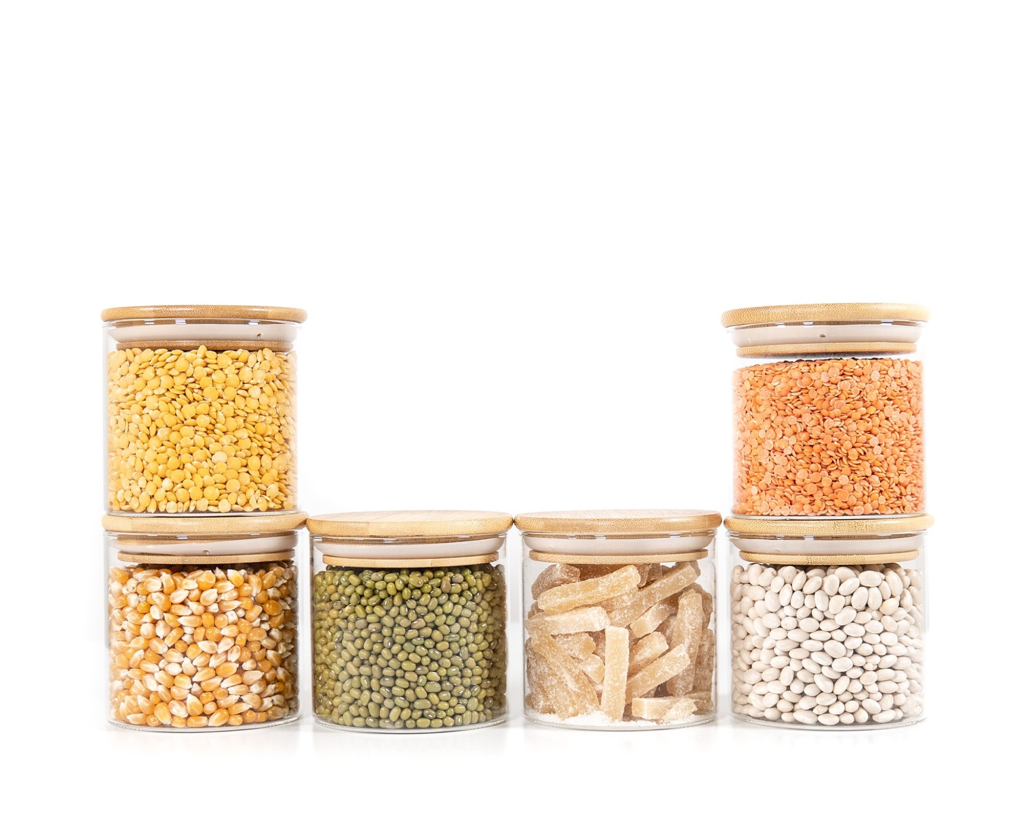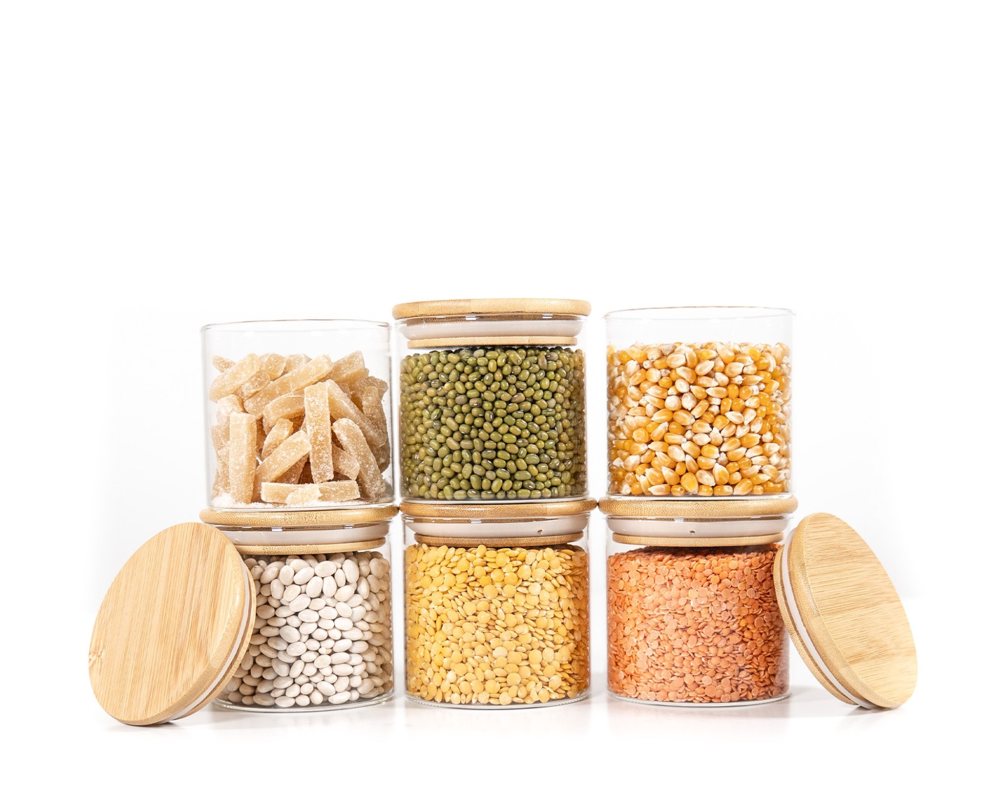 Eleganti contenitori in vetro con coperchi rotondi in bambù