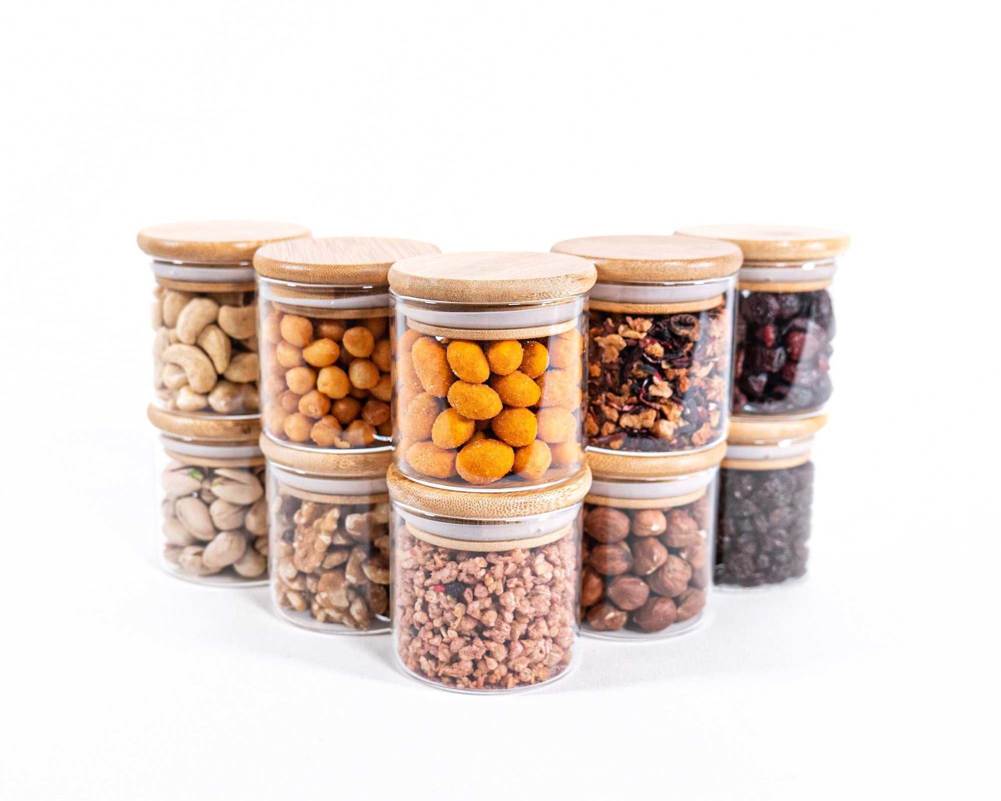Barattoli di stoccaggio stretti alti 6 cm con coperchi in bambù, set da 10